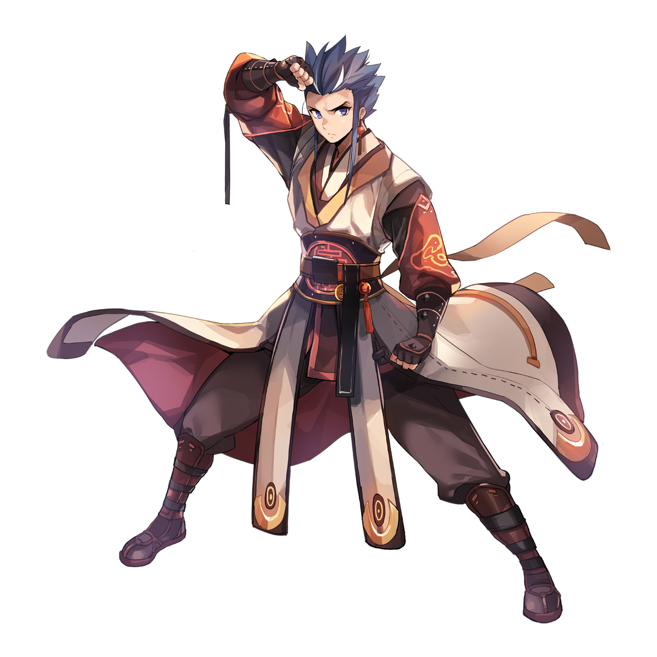 1boy belt black_hair brown_belt brown_gloves brown_pants brown_shirt brown_shoes clenched_hands closed_mouth coat fighting_stance fingerless_gloves frown full_body gloves highres korean_clothes leona_(pixiv) long_sleeves looking_at_viewer male_focus medium_hair official_art pants puffy_long_sleeves puffy_sleeves purple_eyes ragnarok_online shin_guards shirt shoes sidelocks simple_background sky_emperor_(ragnarok_online) solo spiked_hair standing tachi-e transparent_background v-shaped_eyebrows white_coat