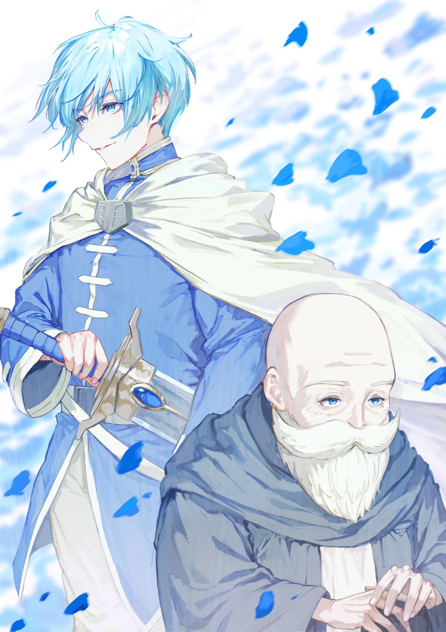 2boys age_comparison bald beard bishounen blue_eyes blue_hair blue_tunic cloak dual_persona facial_hair highres himmel_(sousou_no_frieren) male_focus mmi_ryu multiple_boys old old_man parted_lips procreate_(medium) smile sousou_no_frieren sword tunic upper_body weapon white_cloak
