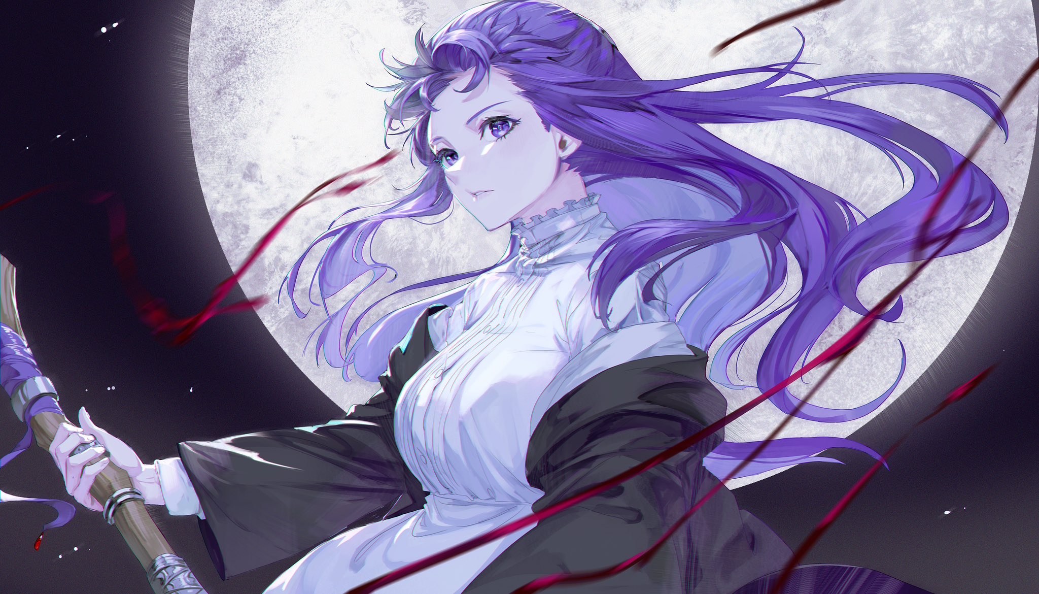 1girl black_robe dress fern_(sousou_no_frieren) floating_hair full_moon highres holding holding_staff looking_afar mage_staff mmi_ryu moon night purple_eyes purple_hair robe solo sousou_no_frieren staff upper_body white_dress