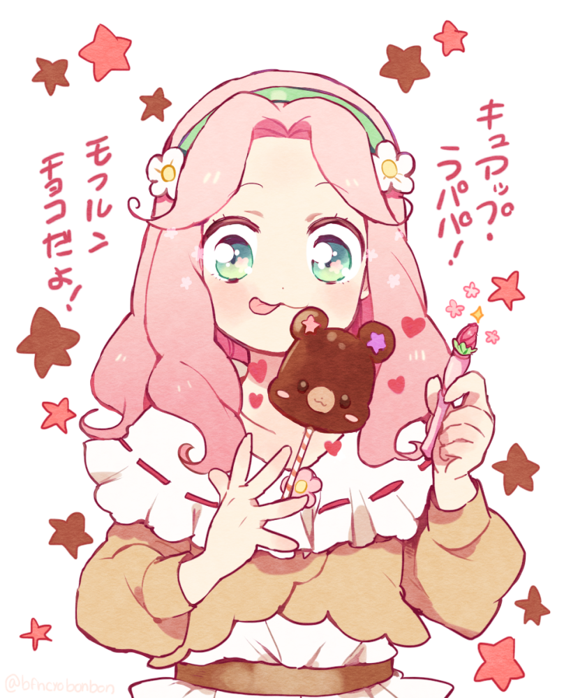 1girl :3 :p brown_cardigan brown_sash brown_sleeves bud candy cardigan character-themed_food closed_mouth collarbone collared_shirt commentary_request eyelashes flower flower_in_eye food frilled_shirt frilled_shirt_collar frills green_eyes green_hairband hair_flower hair_ornament hairband hanami_kotoha hayashi_(kanzume) heart holding holding_candy holding_food holding_lollipop holding_pen light_blush lollipop long_hair long_sleeves looking_at_food mahou_girls_precure! mofurun_(precure) pen pink_flower precure puffy_long_sleeves puffy_sleeves ribbon-trimmed_collar ribbon_trim sash shirt simple_background smile solo sparkle star_(symbol) symbol_in_eye tongue tongue_out translation_request upper_body waist_sash white_background white_flower white_shirt