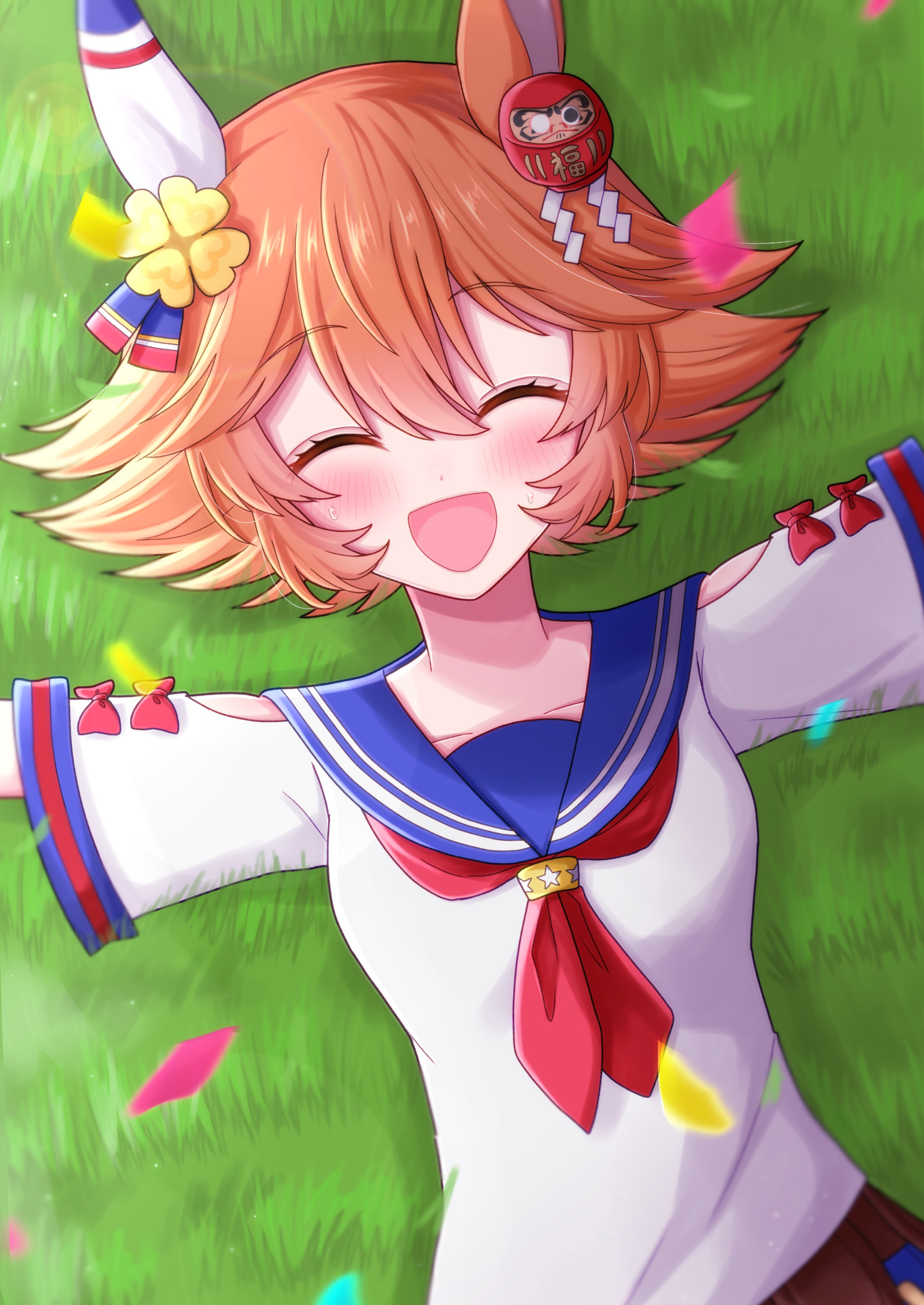 1girl absurdres animal_ears bare_shoulders blush closed_eyes clover commentary_request confetti daruma_doll flipped_hair four-leaf_clover grass hair_between_eyes highres horse_ears horse_girl matikanefukukitaru_(umamusume) on_ground open_mouth orange_hair outstretched_arms shirt short_hair smile solo spread_arms tyamu_mu umamusume upper_body white_shirt