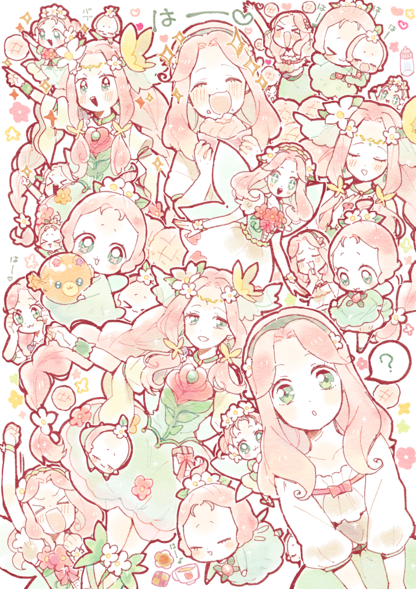 >_< +_+ 3girls :3 :o ? ^_^ baby ball beachball blush braid bread bubble_skirt bug butterfly butterfly_earrings butterfly_hair_ornament buttons circle closed_eyes collarbone commentary_request cowboy_shot crumbs cure_felice dress earrings eating eyelashes fairy_wings feet_out_of_frame fist_pump floating_earrings flower food frilled_skirt frills green_dress green_eyes green_footwear green_hairband green_ribbon green_skirt green_sleeves green_vest grey_vest ha-chan_(precure) hair_flower hair_ornament hairband hanami_kotoha hands_on_own_face hayashi_(kanzume) heart heart_in_eye heart_print highres holding holding_ball insect jewelry light_blush long_hair long_sleeves looking_at_viewer low_twin_braids magical_girl mahou_girls_precure! miniskirt mofurun_(precure) multiple_girls multiple_persona multiple_views open_mouth pink_flower pink_hair pink_rose precure puffy_long_sleeves puffy_short_sleeves puffy_sleeves ribbon ribbon_legwear rose shirt shoes short_dress short_sleeves simple_background skirt three-quarter_sleeves sparkle sparkling_eyes spoken_question_mark symbol_in_eye teeth twin_braids upper_teeth_only v-shaped_eyebrows very_long_hair vest white_background white_flower white_shirt white_skirt white_sleeves wings wrist_flower yellow_butterfly