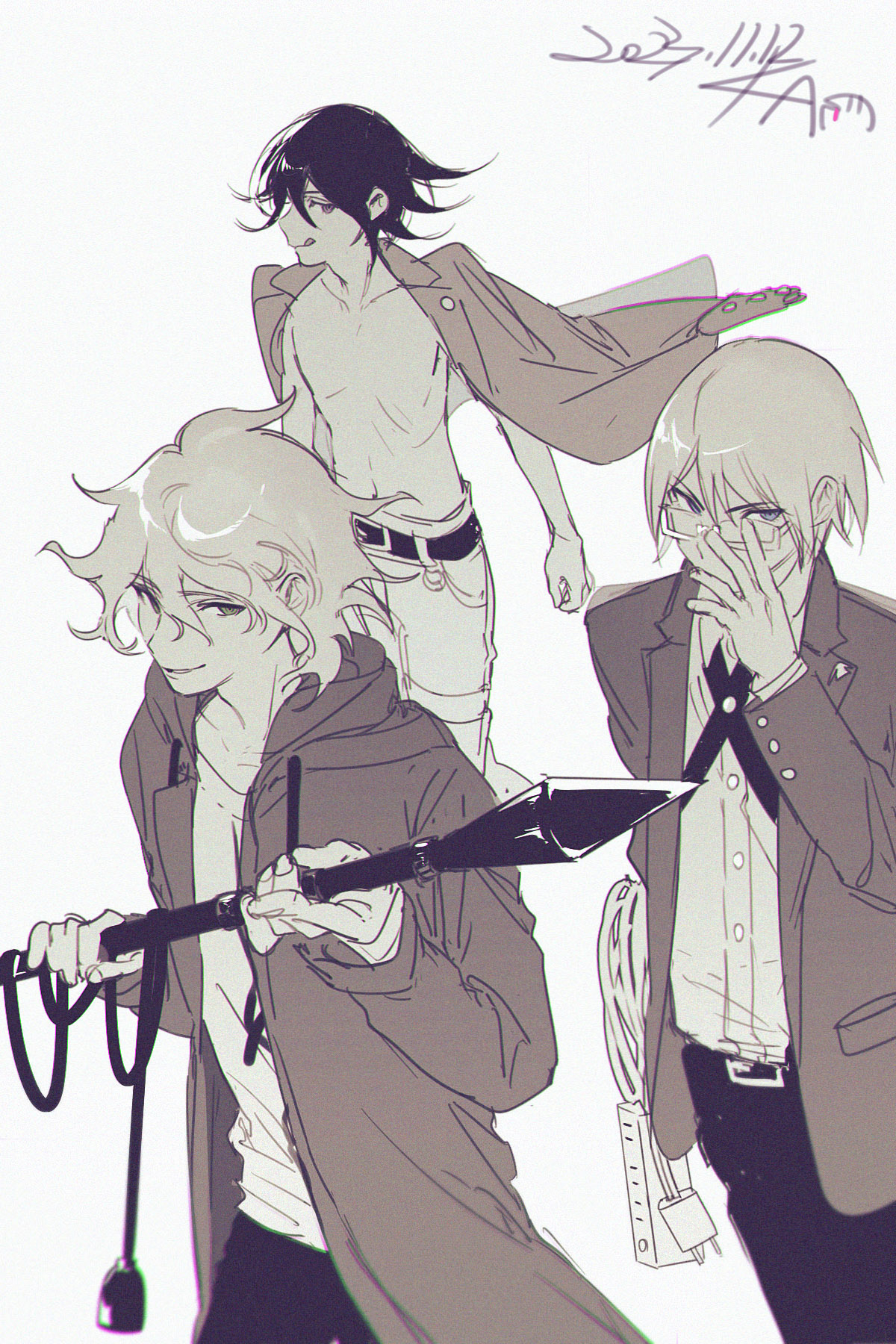 3boys blue_eyes cross_tie danganronpa:_trigger_happy_havoc danganronpa_(series) danganronpa_2:_goodbye_despair danganronpa_v3:_killing_harmony dated disappearoften flipped_hair green_eyes hair_between_eyes highres holding holding_polearm holding_weapon hood hoodie jacket jacket_on_shoulders komaeda_nagito looking_at_viewer male_focus monochrome multiple_boys oma_kokichi open_clothes open_hoodie polearm purple_eyes semi-rimless_eyewear short_hair signature sketch smile spot_color standing togami_byakuya tongue tongue_out topless_male wavy_hair weapon white_background wire