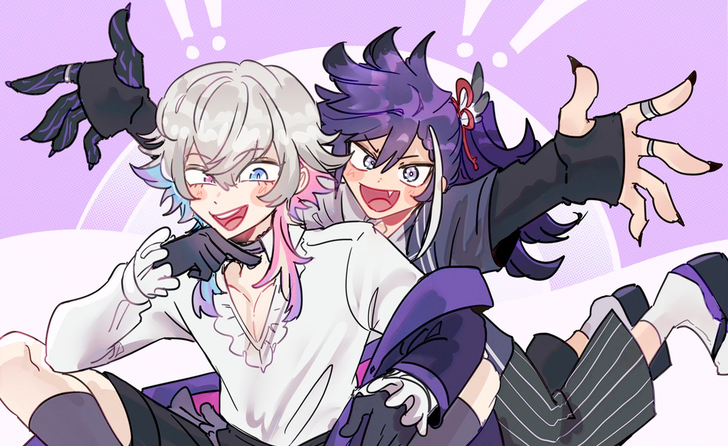 2boys affectionate arms_up banzoin_hakka bishounen black_gloves black_nails black_shorts blue_eyes blue_hair blush coat commentary english_commentary eyelashes eyeshadow fang feather_hair_ornament feathers frilled_shirt frills gavis_bettel geta gloves grey_hair hair_ornament happy heterochromia holostars holostars_english jewelry long_hair looking_at_viewer makeup male_focus ministarfruit multicolored_hair multiple_boys multiple_rings open_clothes open_coat open_mouth pants pectoral_cleavage pectorals pink_eyes pink_hair pinstripe_pants pinstripe_pattern ponytail purple_hair ring sandals shirt shorts sitting smile socks virtual_youtuber white_socks