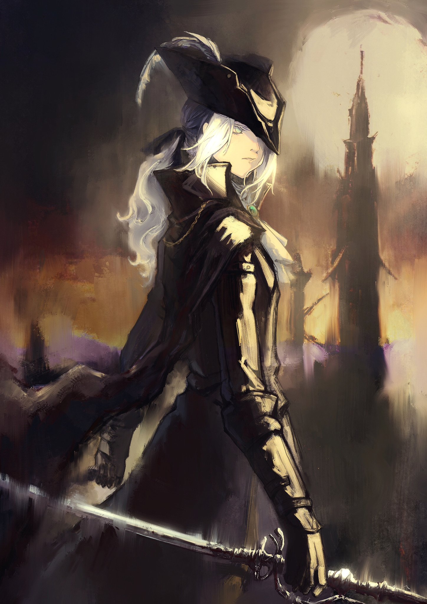 1girl ascot black_gloves black_jacket bloodborne blue_eyes bonnet cape double_blade from_side gloves hat hat_feather highres huanyan420112 jacket lady_maria_of_the_astral_clocktower low_ponytail moon ponytail rakuyo_(bloodborne) sidelocks solo tricorne white_ascot white_hair