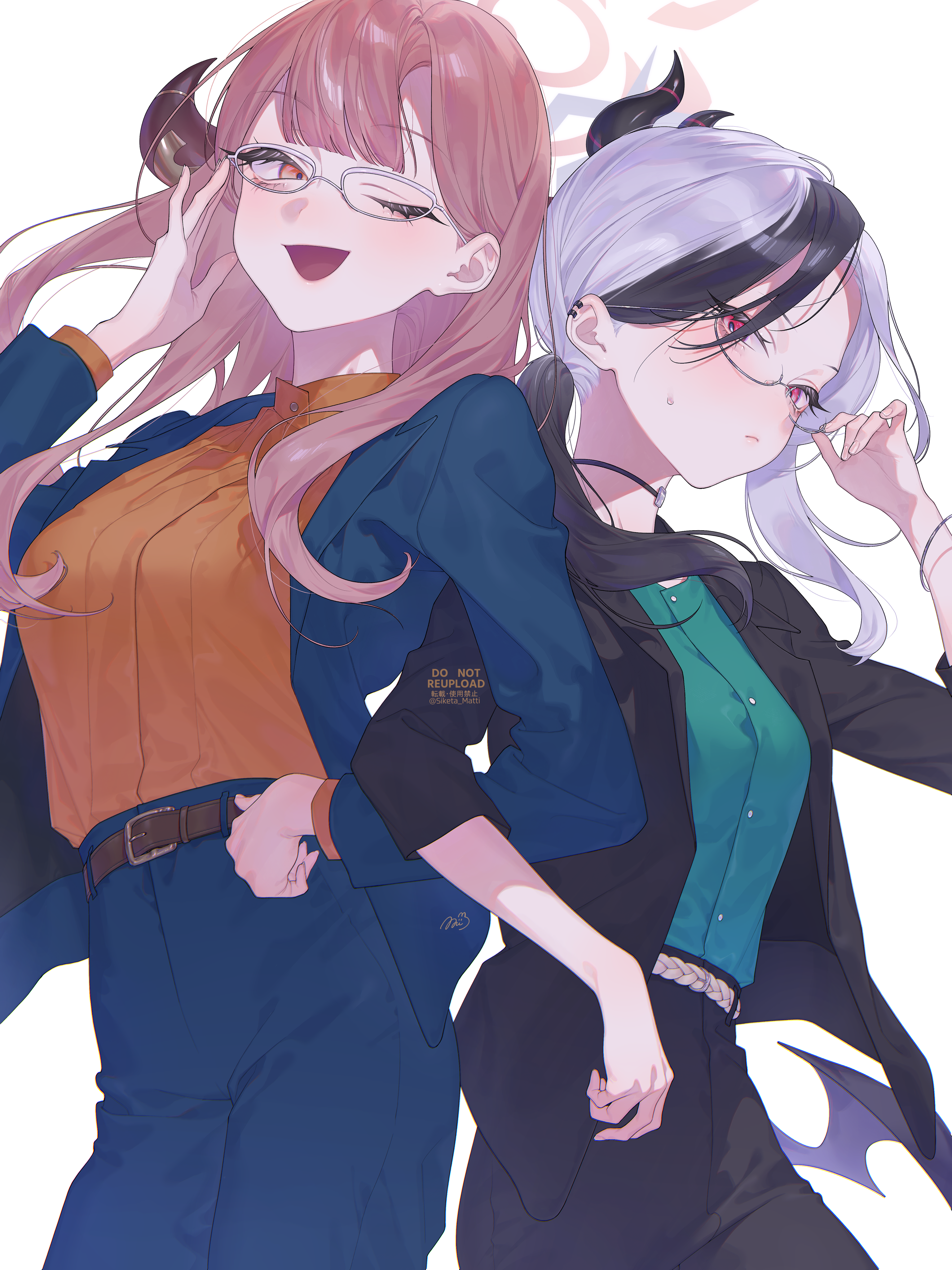 2girls absurdres adjusting_eyewear aru_(blue_archive) belt black_choker black_suit blue_archive blue_suit blush choker formal_clothes glasses highres horns jacket kayoko_(blue_archive) locked_arms long_eyelashes long_hair looking_at_another mizuki_mau multicolored_hair multiple_girls one_eye_closed open_clothes open_jacket pants red_eyes smile standing suit sweatdrop two-tone_hair upper_body white_background