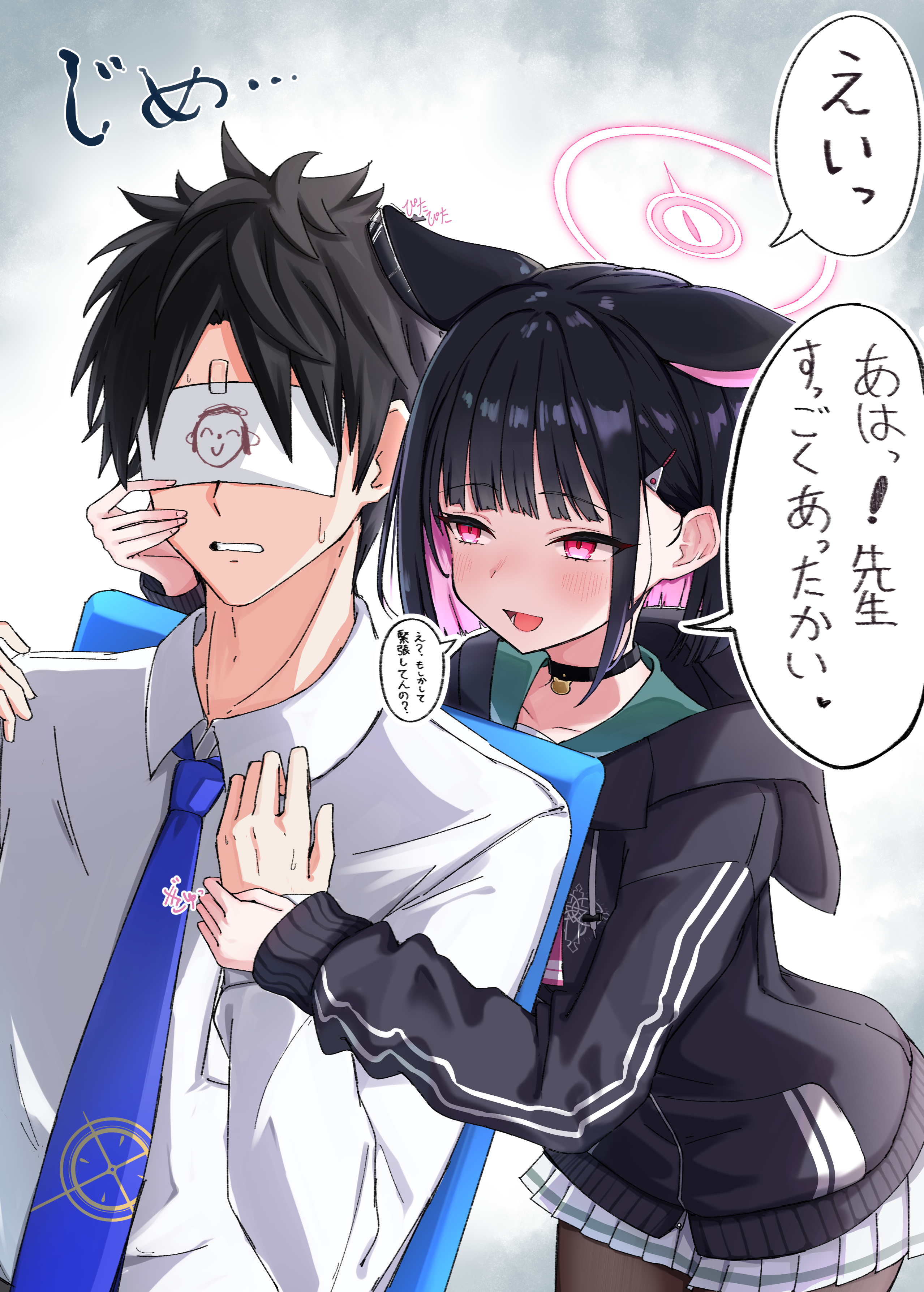1boy 1girl absurdres animal_ears black_choker black_hair black_jacket blue_archive blue_necktie blush caffeinechara cat_ears choker collared_shirt colored_inner_hair extra_ears hair_ornament hairclip halo highres hood hood_down hooded_jacket jacket kazusa_(blue_archive) long_sleeves multicolored_hair necktie open_mouth pink_hair pink_halo pleated_skirt red_eyes sensei_(blue_archive) shirt short_hair skirt smile white_shirt white_skirt