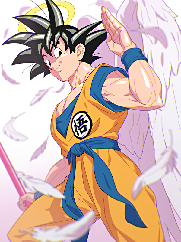 1boy angel_wings black_eyes black_hair commentary dougi dragon_ball dragonball_z english_commentary feathers halo looking_at_viewer male_focus mixed-language_commentary muscular muscular_male salute short_hair solo son_goku wings yellow_halo yonezawa_mao