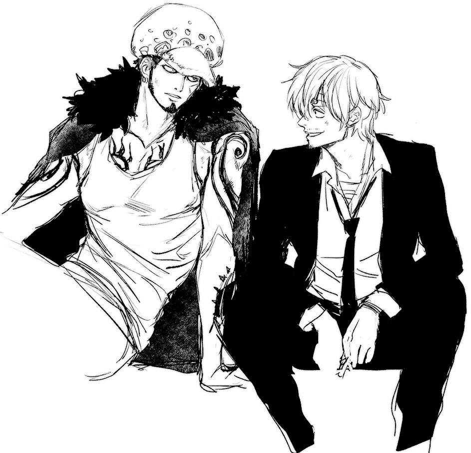 2boys arm_support arm_tattoo blush cape chest_tattoo chief_(chiefvinsmoke) cigarette curly_eyebrows earrings facial_hair formal_clothes fur_cape fur_hat goatee hair_over_one_eye hat jacket jewelry long_sleeves looking_at_another male_focus monochrome multiple_boys necktie one_piece pants sanji_(one_piece) shirt short_hair shoulder_tattoo sitting sketch tank_top tattoo trafalgar_law yaoi