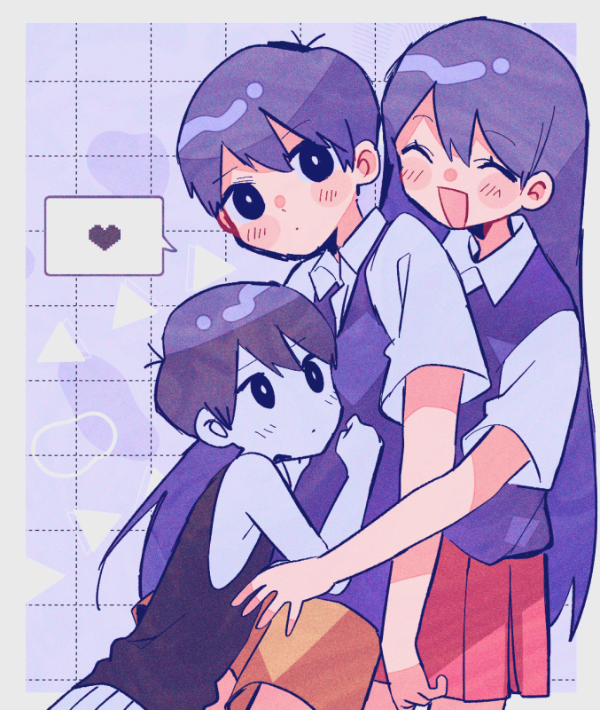 1girl 2boys antenna_hair arm_at_side bare_shoulders black_eyes black_tank_top blush border bright_pupils brother_and_sister closed_eyes closed_mouth collared_shirt colored_skin dual_persona grey_border grid_background hair_between_eyes heart leaning_on_person long_hair looking_at_another looking_at_viewer mari_(headspace)_(omori) mari_(omori) multiple_boys omori omori_(omori) open_mouth orange_shorts purple_background purple_hair purple_sweater_vest red_skirt shirt short_hair short_sleeves shorts siblings skirt sleeveless smile spoken_heart striped_clothes striped_shorts sunny_(omori) sweater_vest tank_top vertical-striped_clothes vertical-striped_shorts white_pupils white_shorts white_skin yuusuke-kun
