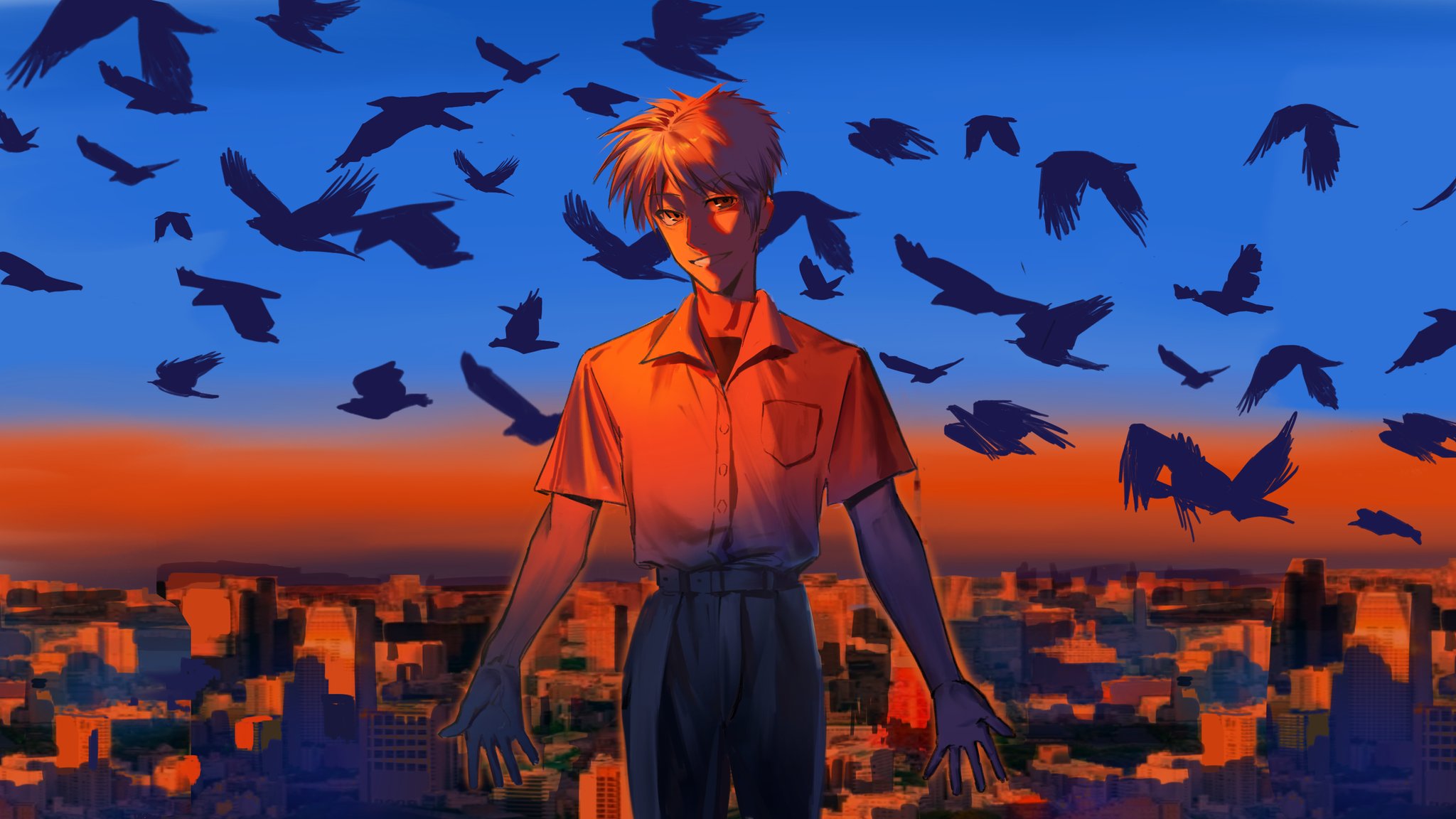 1boy akagi:_yami_ni_oritatta_tensai akagi_shigeru belt bird black_belt black_pants blue_sky breast_pocket buttons city cityscape collared_shirt commentary_request cowboy_shot flock fukumoto_mahjong grin highres horizon looking_at_viewer male_focus pants pocket red_shirt red_sky shirt short_hair short_sleeves sky smile solo split_theme zhaiju2