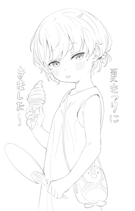 1girl :p bag blush dress flat_chest food greyscale hair_bobbles hair_ornament hand_fan handbag hatoba_tsugu ice_cream looking_at_viewer mole mole_under_eye monochrome nekopantsu_(blt) short_hair simple_background sketch solo tongue tongue_out tsugu_(vtuber)
