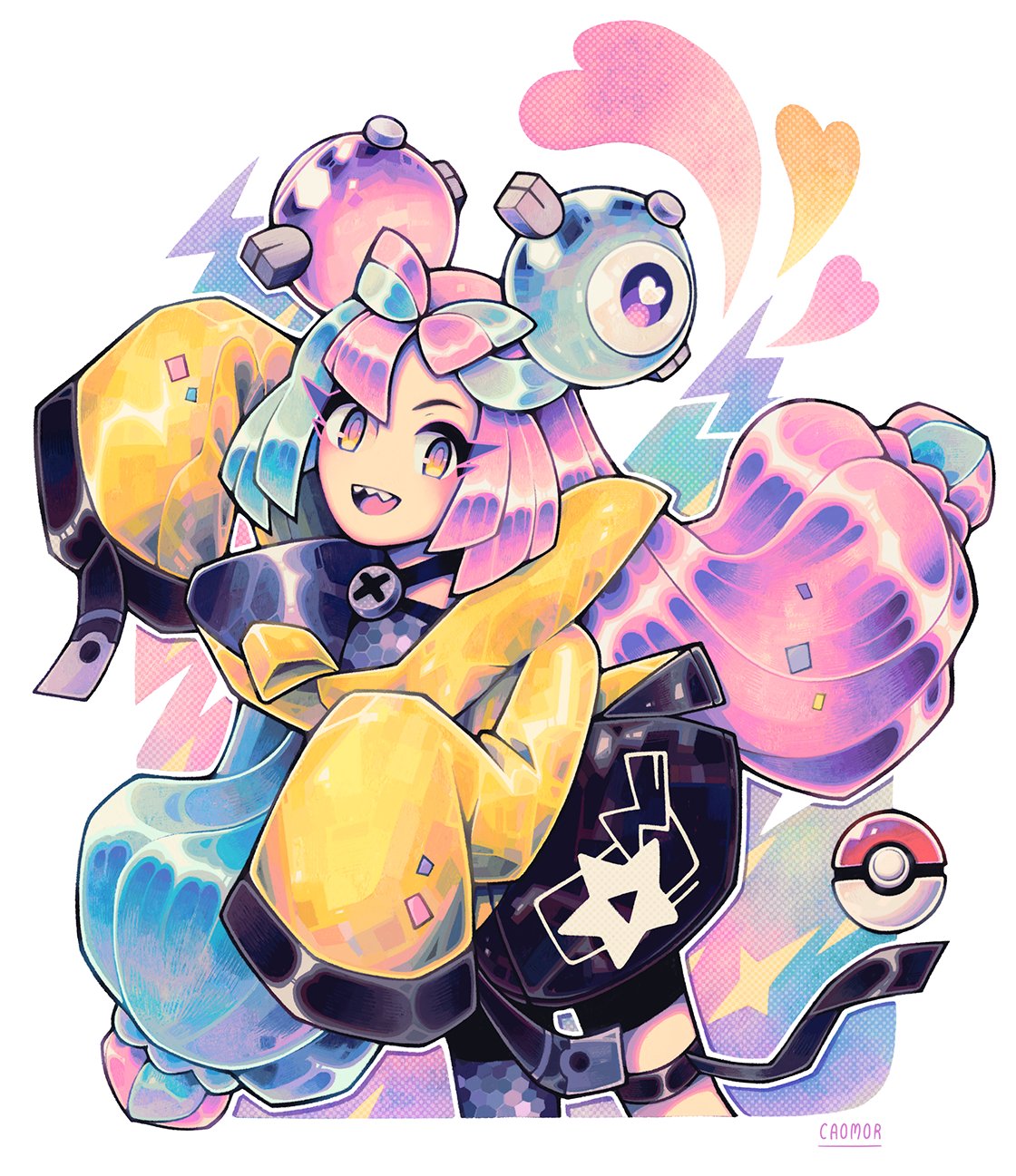 1girl artist_name blue_hair bow-shaped_hair caomor commentary heart highres iono_(pokemon) long_hair long_sleeves looking_at_viewer multicolored_hair nintendo open_mouth pink_hair poke_ball poke_ball_(basic) pokemon pokemon_scarlet_and_violet sharp_teeth simple_background single_leg_pantyhose sleeves_past_fingers sleeves_past_wrists smile solo split-color_hair teeth twintails twitter_username two-tone_hair upper_teeth_only white_background wide_sleeves