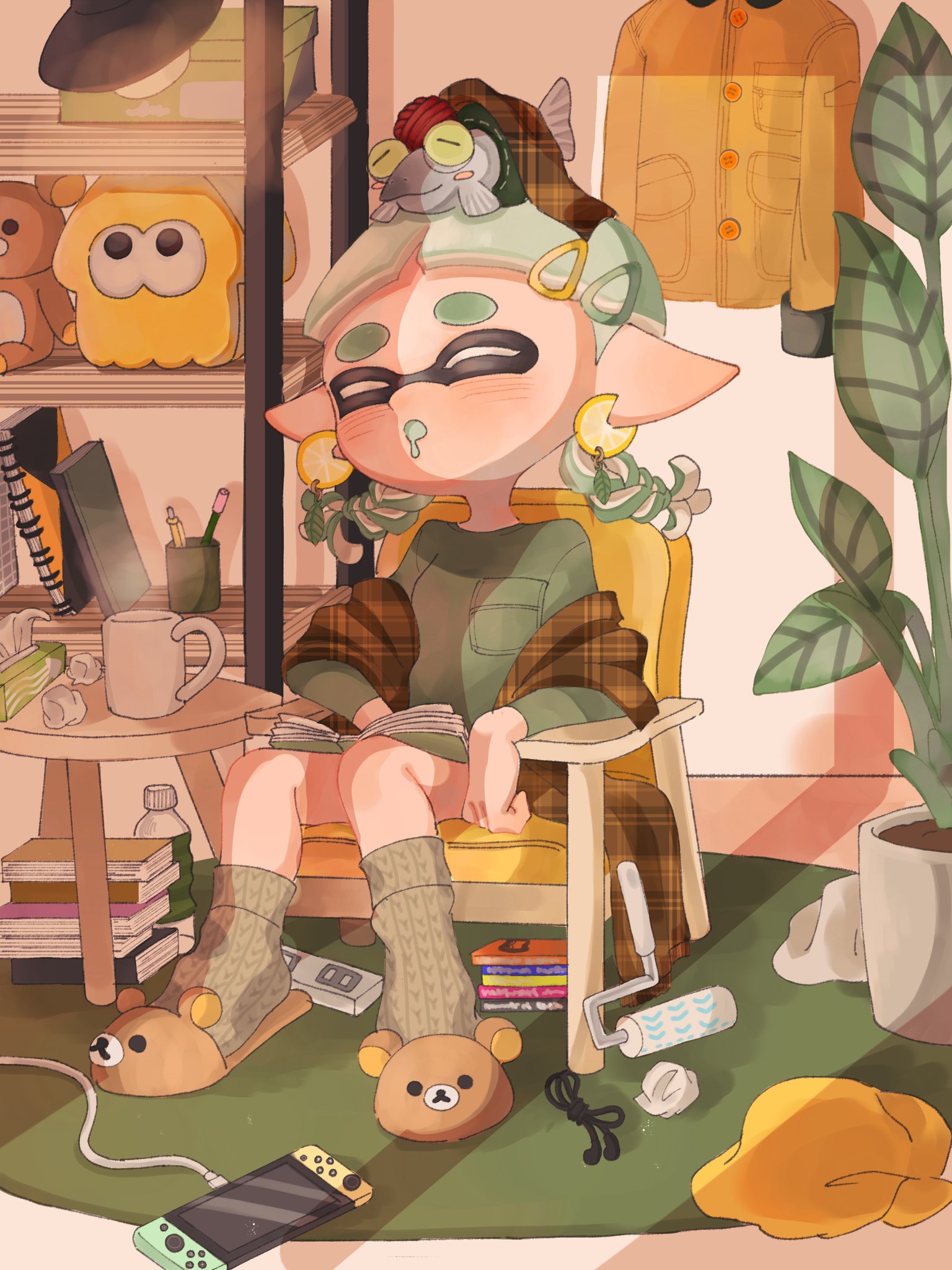 1girl animal_slippers blanket book book_stack bottle cable chair closed_eyes commentary_request cup earrings food-themed_earrings green_shirt hair_ornament hairclip highres indoors inkling inkling_girl inkling_player_character jacket jewelry lemo_(lemo_4) medium_hair nintendo nintendo_switch on_chair open_book paint_roller pencil plaid_blanket plant pointy_ears potted_plant shelf shirt sitting slippers smallfry_(splatoon) splatoon_(series) splatoon_3 table tentacle_hair thick_eyebrows tissue tissue_box yellow_jacket