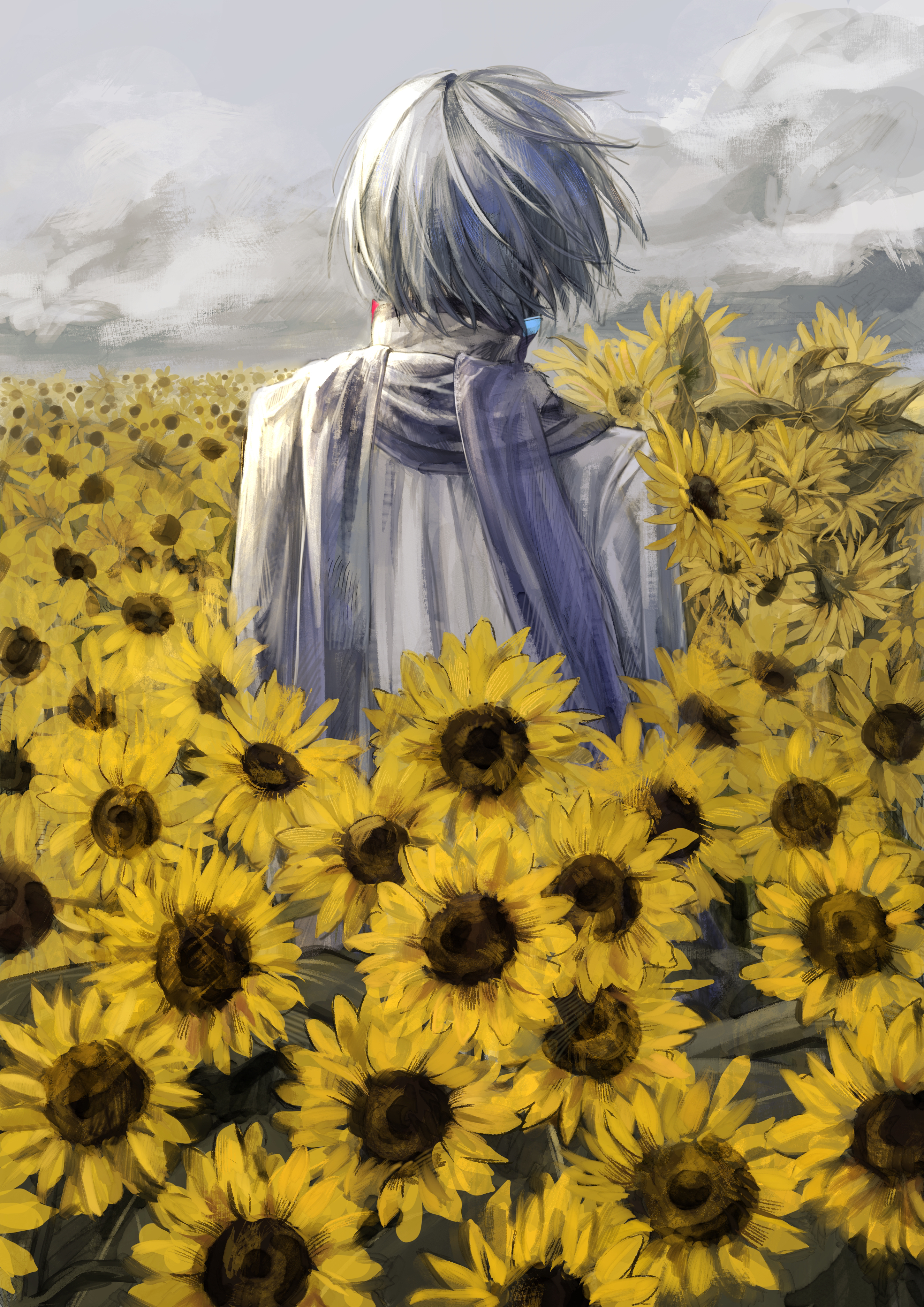 1boy absurdres blue_hair blue_scarf cloud cloudy_sky coat commentary field floating_hair flower flower_field from_behind high_collar highres ill_0619 kaito_(vocaloid) male_focus scarf short_hair sky solo standing sunflower sunflower_field untranslatable_commentary vocaloid white_coat