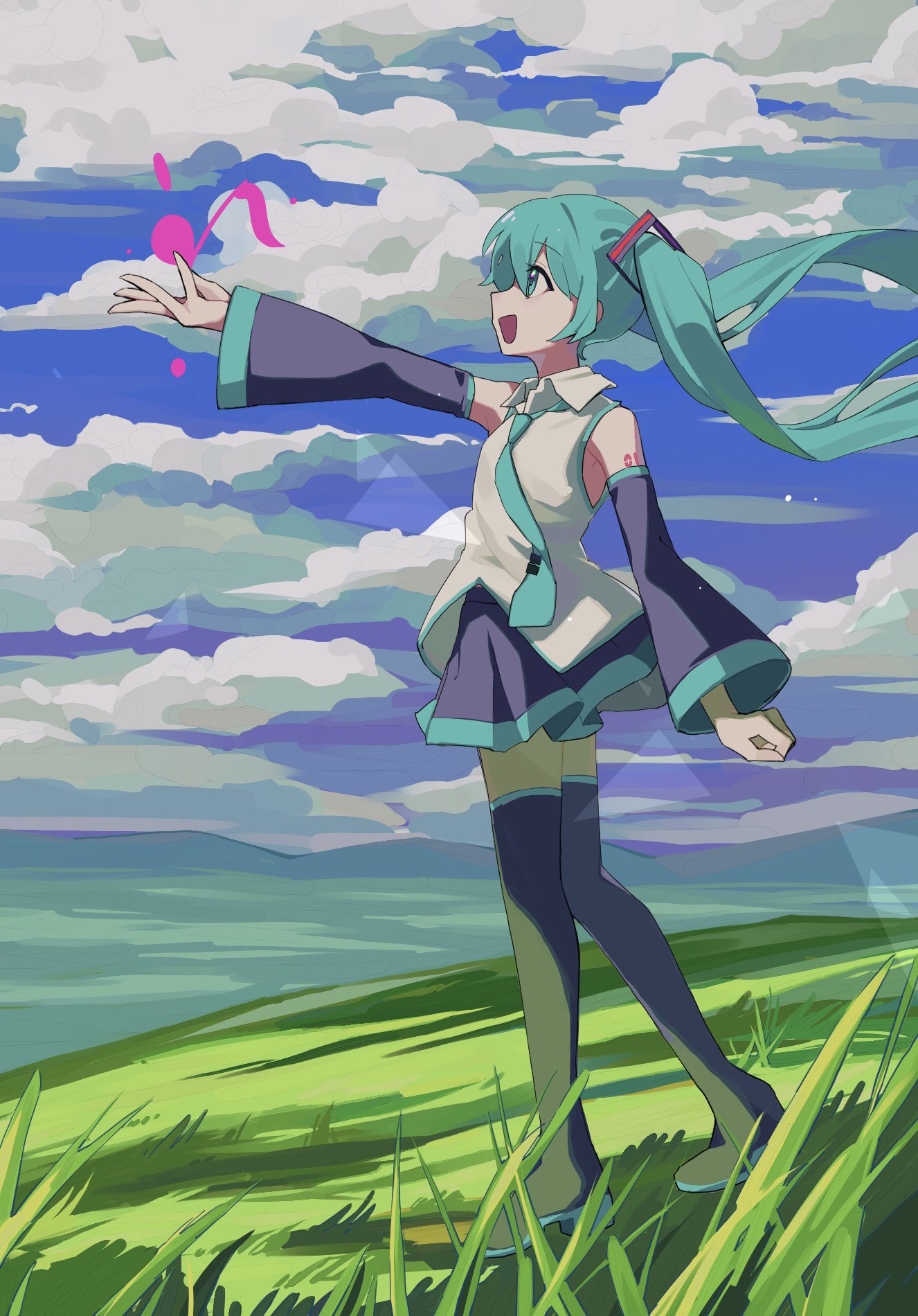 1girl :d arm_at_side asa_(o0_asa_0o) bare_shoulders black_boots black_skirt black_sleeves blue_eyes blue_hair blue_necktie blue_sky boots cloud cloudy_sky collared_shirt day detached_sleeves floating_hair from_side full_body grass hair_ornament hatsune_miku highres hill landscape long_sleeves looking_ahead miniskirt mountainous_horizon nature necktie number_tattoo open_hand open_mouth outdoors outstretched_arm pleated_skirt profile shirt sidelocks skirt sky sleeveless sleeveless_shirt smile solo tattoo thigh_boots thighhighs tie_clip twintails vocaloid white_shirt wind zettai_ryouiki