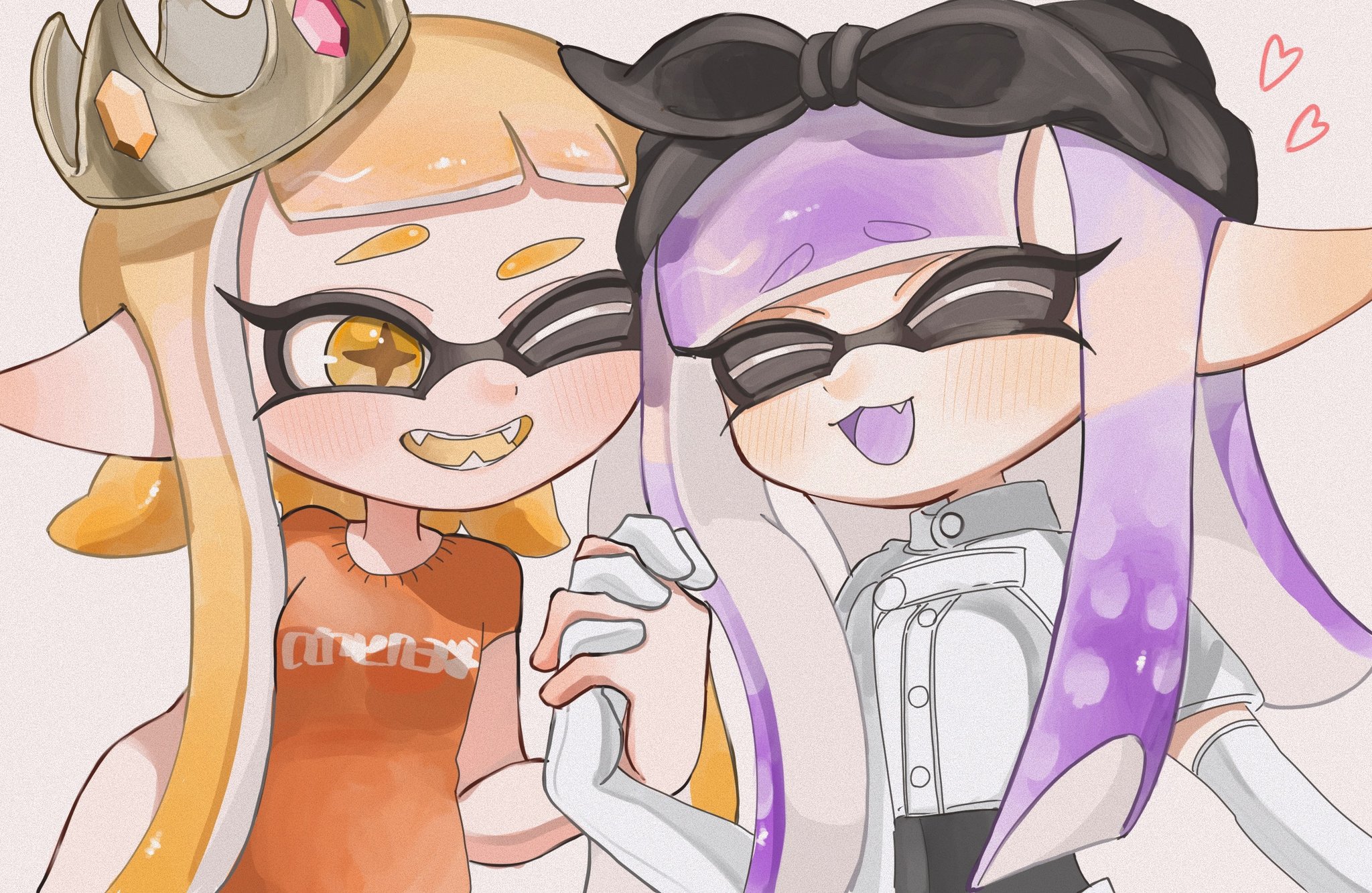 2girls black_bow black_hairband blush bow bow_hairband closed_eyes commentary_request crown eyebrows_hidden_by_hair eyelashes fang grey_background grey_headwear hair_bow hairband heart highres holding_hands inkling inkling_girl inkling_player_character jacket lemo_(lemo_4) long_hair multiple_girls nintendo one_eye_closed open_mouth orange_eyes orange_hair orange_shirt pointy_ears print_shirt purple_hair shirt simple_background smile splatoon_(series) teeth tentacle_hair thick_eyebrows upper_body white_jacket
