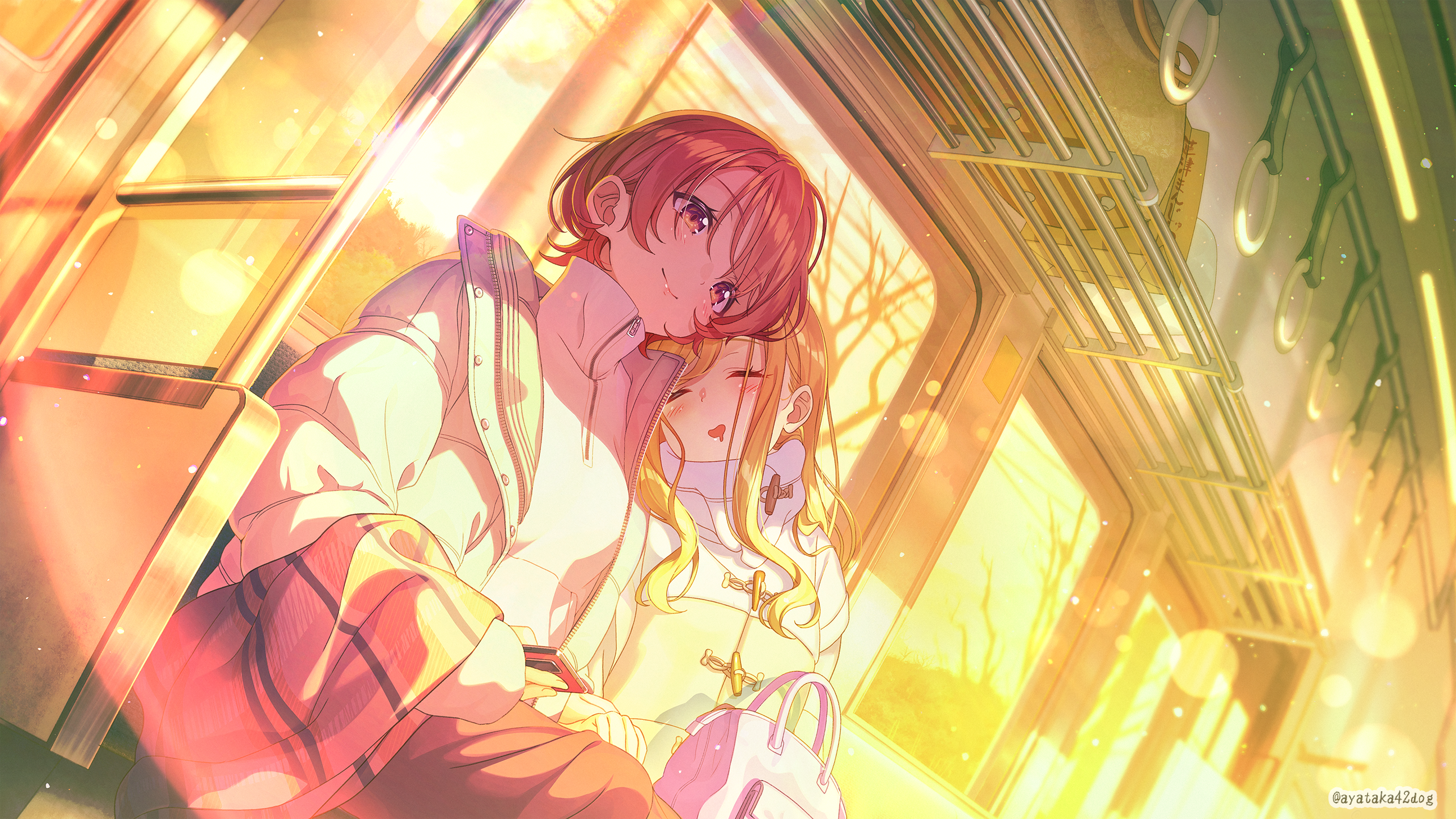 2girls ayataka bag blurry bokeh closed_eyes closed_mouth coat commentary_request depth_of_field drooling dutch_angle evening hand_grip highres leaning_on_person lens_flare long_hair long_sleeves mouth_drool multiple_girls open_clothes open_coat orange_hair original pink_hair short_hair sitting sleeping sleeping_on_person sleeping_upright smile train_interior turtleneck twitter_username white_coat winter_clothes