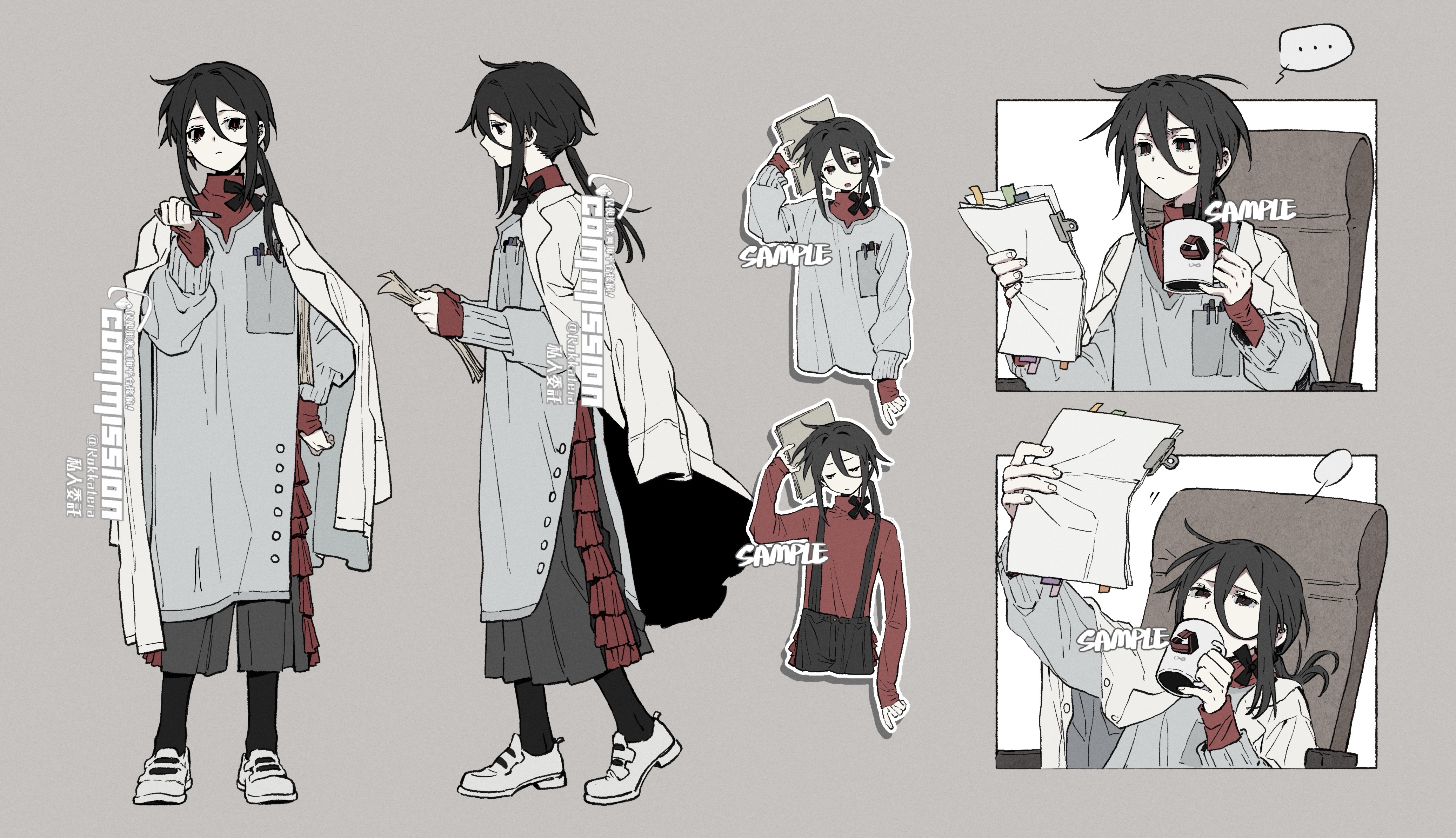 ... 1girl absurdres apron arm_up artist_name black_eyes black_hair black_socks book breast_pocket chair chinese_commentary chinese_text closed_mouth coat coffee_mug commission cropped_legs cup full_body grey_apron grey_background hair_between_eyes hand_up highres holding holding_book holding_cup holding_paper holding_pen jacket long_hair long_skirt long_sleeves looking_at_viewer mug multiple_views office_chair original pantyhose paper pen pocket red_shirt rokkatera sample_watermark shirt shoes sidelocks simple_background skirt sleeves_past_wrists smile sneakers socks speech_bubble spoken_ellipsis standing suspenders sweater swivel_chair turtleneck upper_body watermark white_coat white_footwear