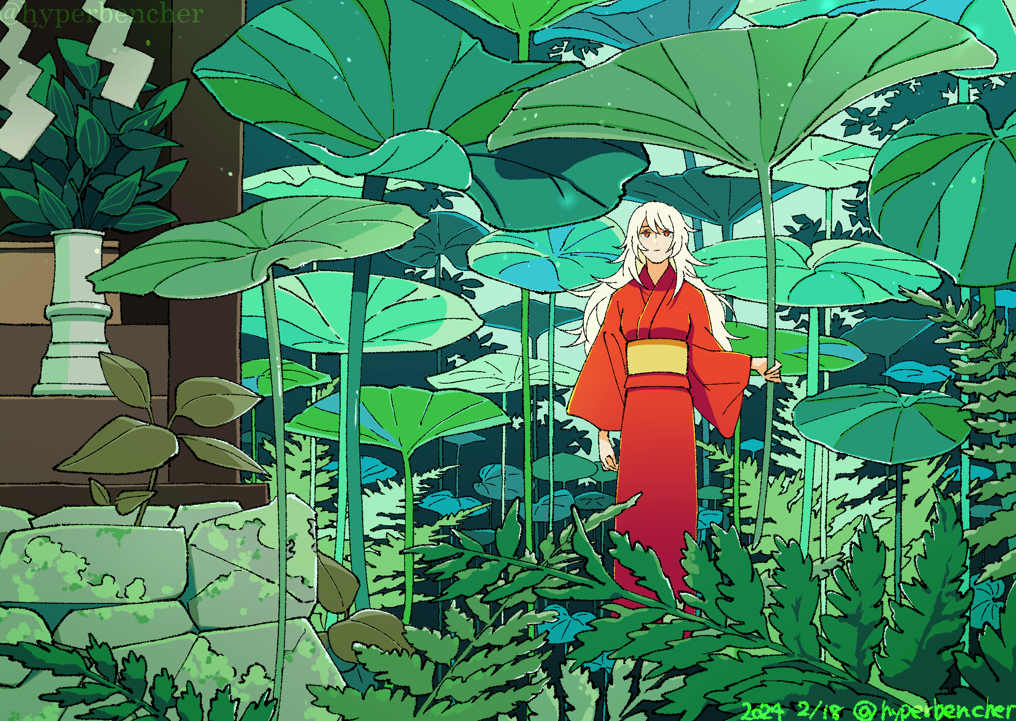 1girl dated day highres hyperbencher japanese_clothes kimono leaf long_hair moss original outdoors plant potted_plant red_eyes red_kimono rock scenery solo tree water white_hair wide_shot wide_sleeves