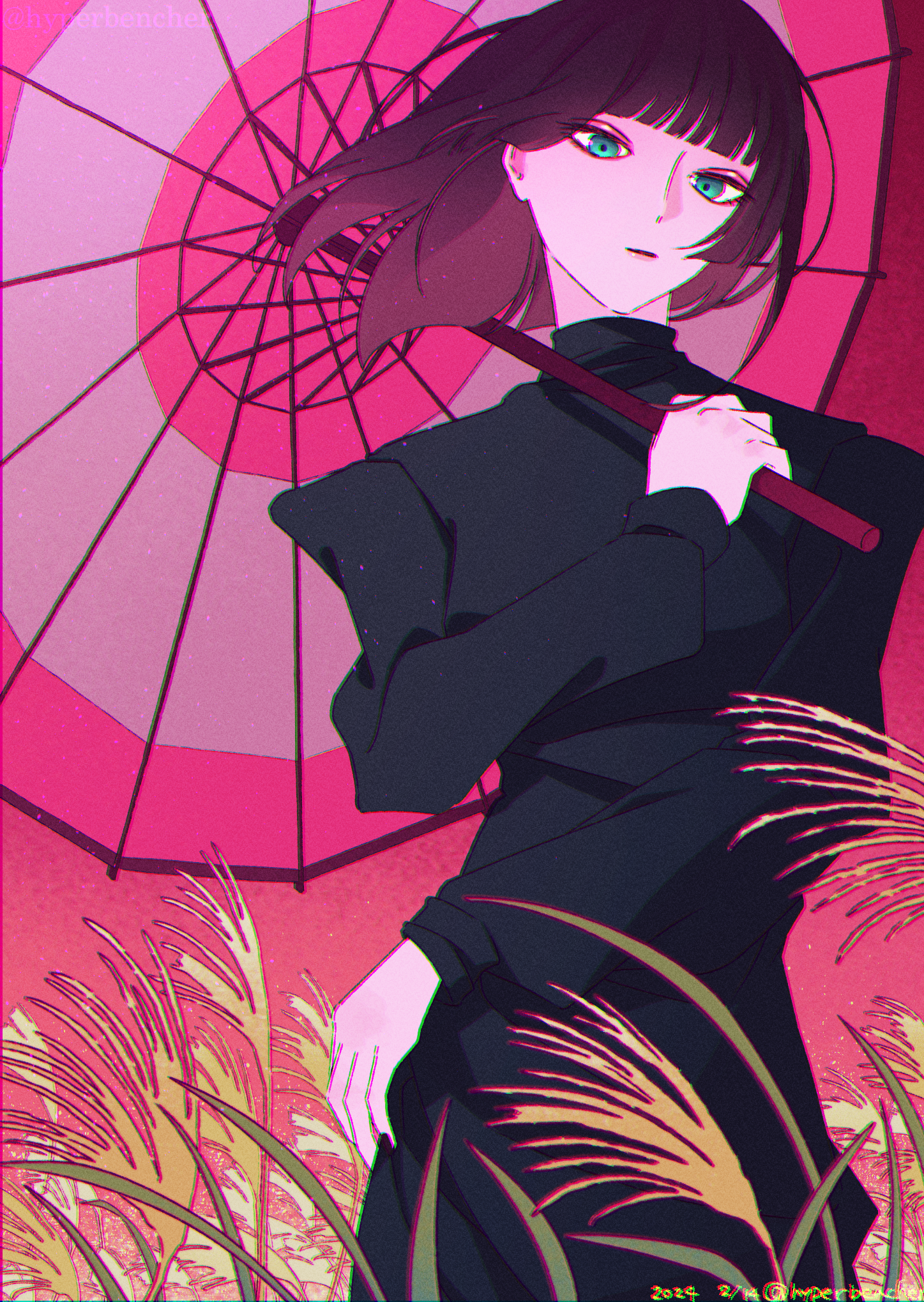 1girl aqua_eyes black_hair black_shirt blunt_bangs chromatic_aberration dated grass highres holding holding_umbrella hyperbencher long_sleeves medium_hair oil-paper_umbrella original pink_sky pink_umbrella shirt sky solo umbrella upper_body