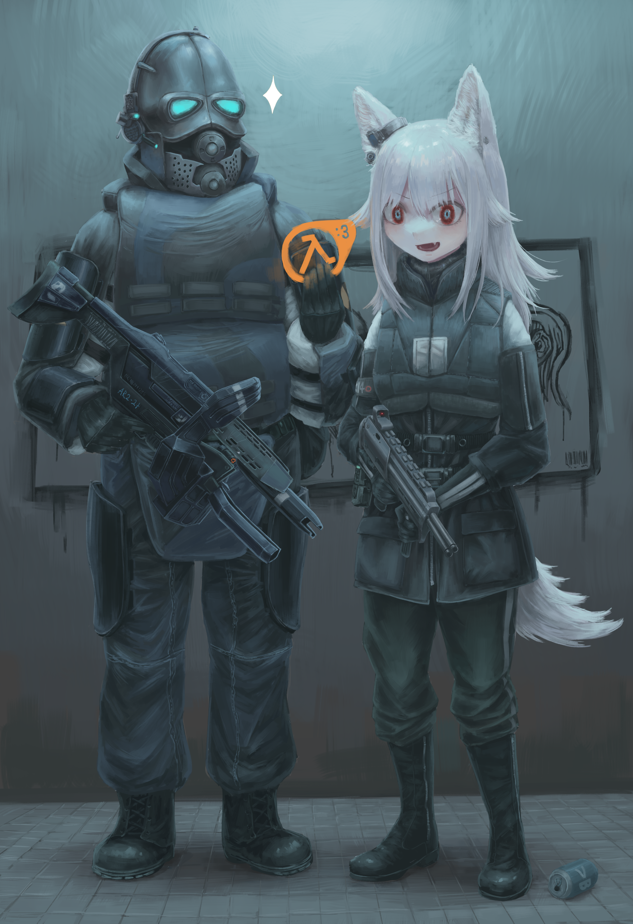 1boy 1girl absurdres animal_ear_fluff animal_ears black_footwear black_gloves body_armor boots can combine_soldier diu9you gloves grey_pants gun half-life half-life_(series) half-life_2 highres long_hair original pants red_eyes submachine_gun tail tile_floor tiles weapon white_hair wolf_ears wolf_tail