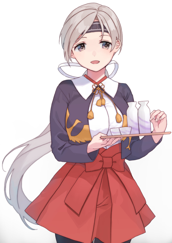 1girl black_jacket blush breasts chitose_(kancolle) choko_(cup) collared_shirt cowboy_shot cup female_focus grey_eyes grey_hair hair_ribbon holding holding_tray jacket kantai_collection large_breasts legs_apart long_hair long_sleeves looking_at_viewer mitsuyo_(mituyo324) open_clothes open_jacket open_mouth pleated_skirt red_skirt ribbon shirt simple_background skirt solo standing tareme tokkuri tray white_background white_ribbon white_shirt
