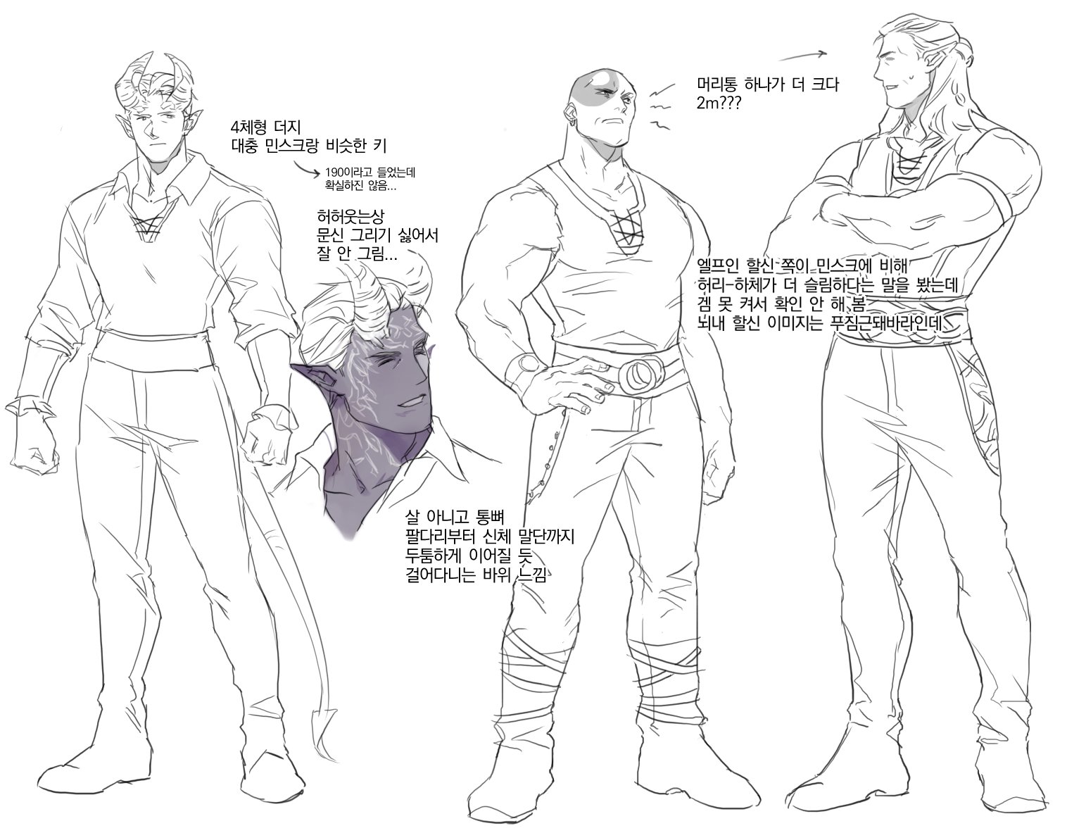 3boys akdrpa bald baldur's_gate baldur's_gate_3 bara character_request check_character cross-laced_slit dark-skinned_male dark_skin elf facepaint full_body greyscale halsin horns korean_text male_focus mature_male medium_hair monochrome monster_boy multiple_boys muscular muscular_male partially_colored pectorals pointy_ears standing tav_(baldur's_gate) thick_eyebrows translation_request