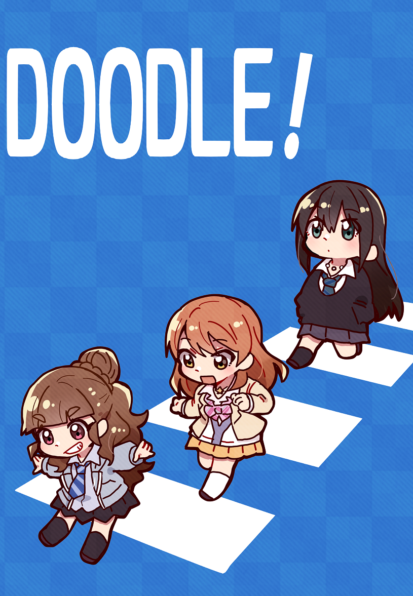 3girls amaiwashi black_hair black_socks blue_background blunt_bangs blush bow bowtie braid braided_bangs brown_hair checkered_background chibi chibi_only commentary_request diagonal-striped_bow diagonal-striped_bowtie diagonal-striped_clothes diagonal-striped_necktie english_text full_body grin hair_bun hojo_karen idolmaster idolmaster_cinderella_girls kamiya_nao kneehighs long_hair looking_ahead looking_up multiple_girls necktie orange_hair outstretched_arms school_uniform shibuya_rin single_hair_bun smile socks straight_hair striped_bow striped_bowtie striped_clothes triad_primus_(idolmaster) very_long_hair walking white_socks