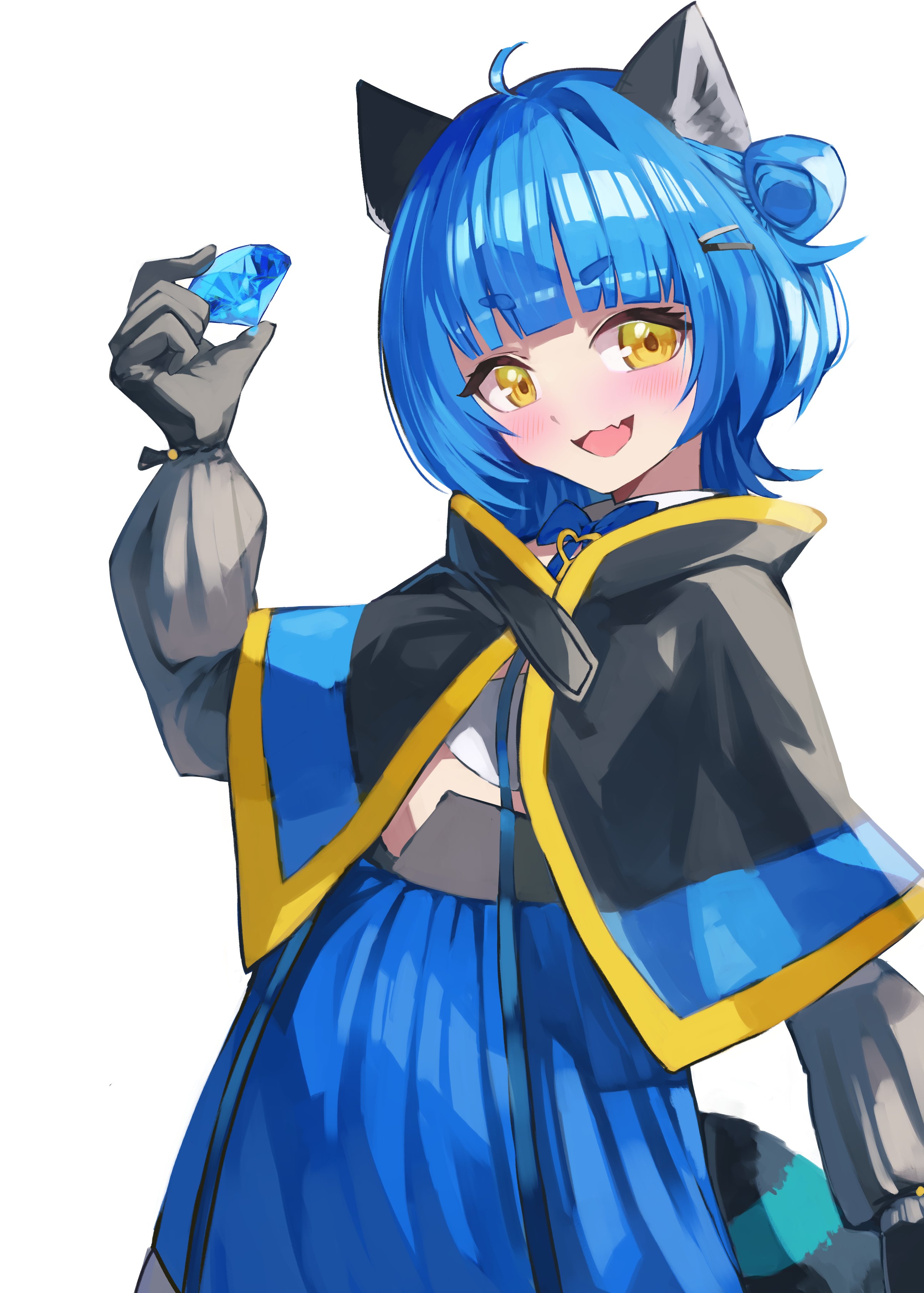 1girl absurdres animal_ears black_capelet blue_capelet blue_hair blue_skirt blush capelet chromashift commission diamond_(gemstone) fang gara_(qbeuxvii22) gem hair_bun hair_ornament hairclip hand_up highres holding holding_gem open_mouth poko_rakun poko_rakun_(1st_costume) raccoon_ears raccoon_girl raccoon_tail second-party_source short_hair skin_fang skirt smile striped_tail tail two-tone_capelet virtual_youtuber yellow_eyes