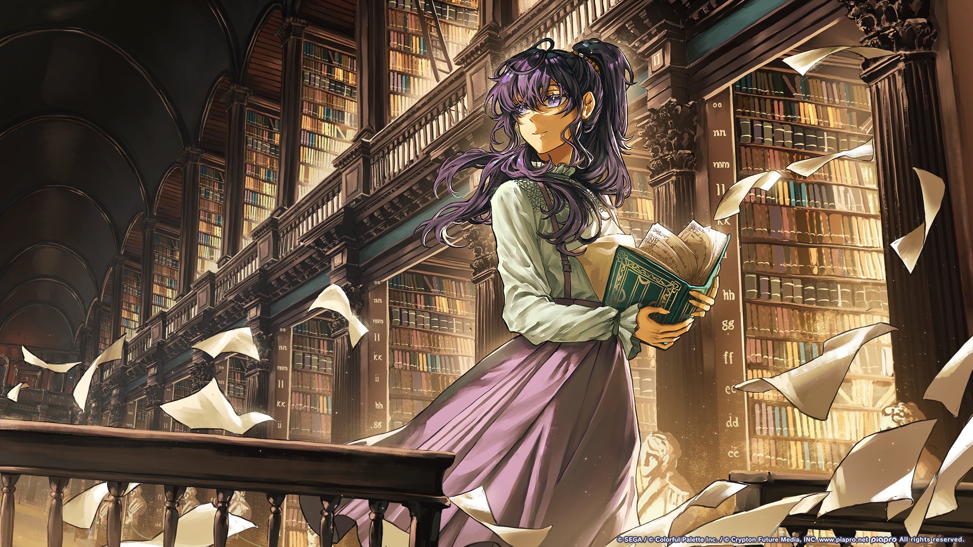 1girl absurdly_detailed_composition asahina_mafuyu book bookshelf bust_(sculpture) closed_mouth commentary copyright_notice english_commentary frilled_shirt frilled_shirt_collar frilled_sleeves frills green_shirt highres holding holding_book indoors ireland ladder library light_particles loaded_interior long_hair long_skirt long_sleeves looking_afar lux_arts official_art open_book paper pillar project_sekai promotional_art purple_eyes purple_hair purple_skirt real_world_location scenery sculpture second-party_source shirt skirt smile solo standing suspender_skirt suspenders
