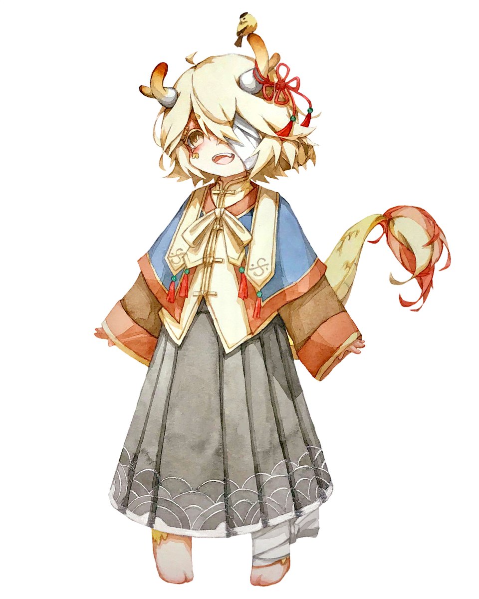 1boy animal animal_feet animal_on_head aoqun bandage_over_one_eye bandaged_leg bandages barefoot billie_x bird bird_on_head black_skirt blue_capelet capelet chinese_clothes colored_eyelashes dragon_boy dragon_horns dragon_tail facial_mark hair_ribbon hanfu highres horns james_(vocaloid) male_focus oliver_(vocaloid) on_head open_mouth red_ribbon ribbon simple_background skirt smile tail teeth traditional_media upper_teeth_only vocaloid white_background yellow_eyes