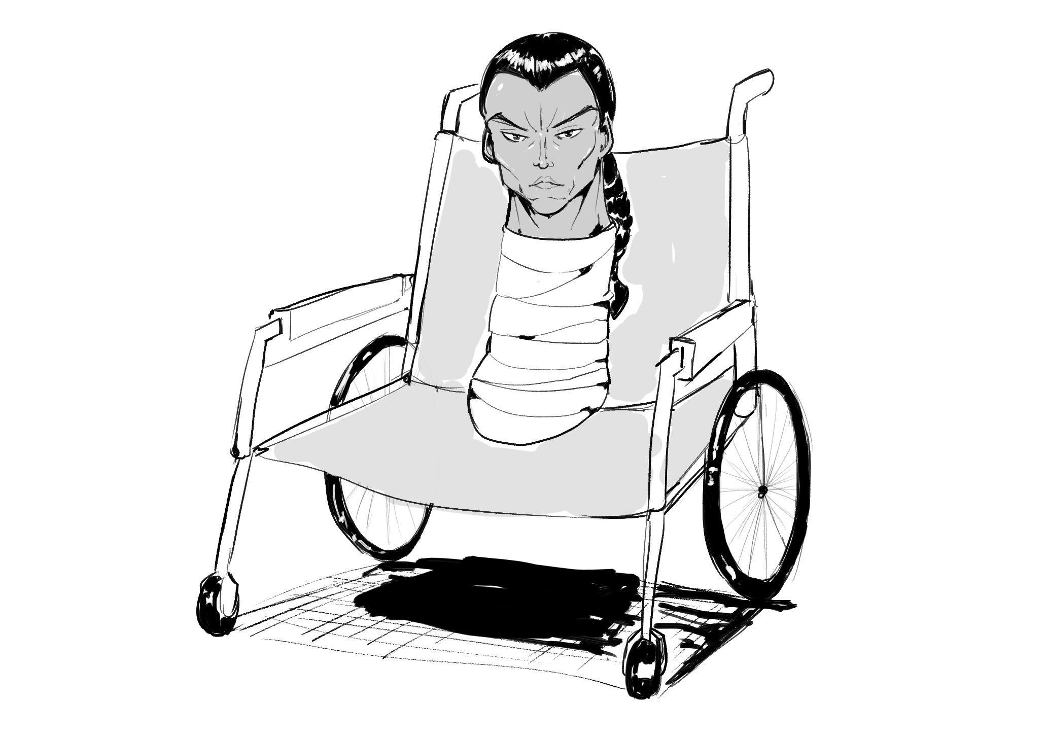 1boy bad_link bandages dark-skinned_male dark_skin drawfag grappler_baki highres meme monochrome ponytail retsu_kaioh retsu_kaioh's_head_lying_in_a_hospital_bed_(meme) sketch solo spongebob_squarepants_(series) wheelchair