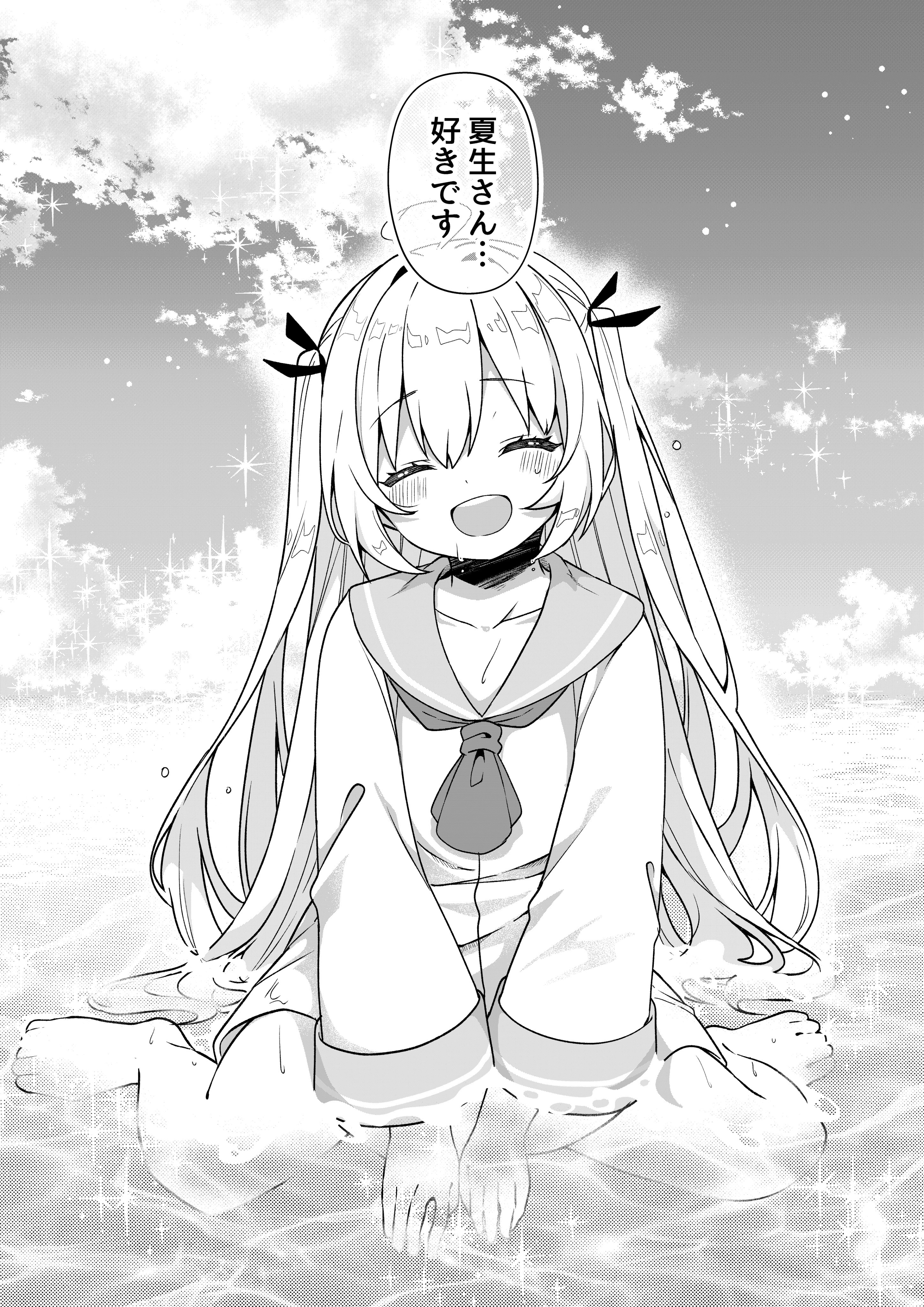 1girl :d ^_^ absurdres atri atri-my_dear_moments- barefoot closed_eyes cloud commentary_request day dress facing_viewer greyscale hair_ribbon highres jako_(jakoo21) long_hair long_sleeves monochrome open_mouth outdoors ribbon sailor_dress shallow_water sitting smile solo translation_request two_side_up very_long_hair wariza water wet wet_hair wide_sleeves