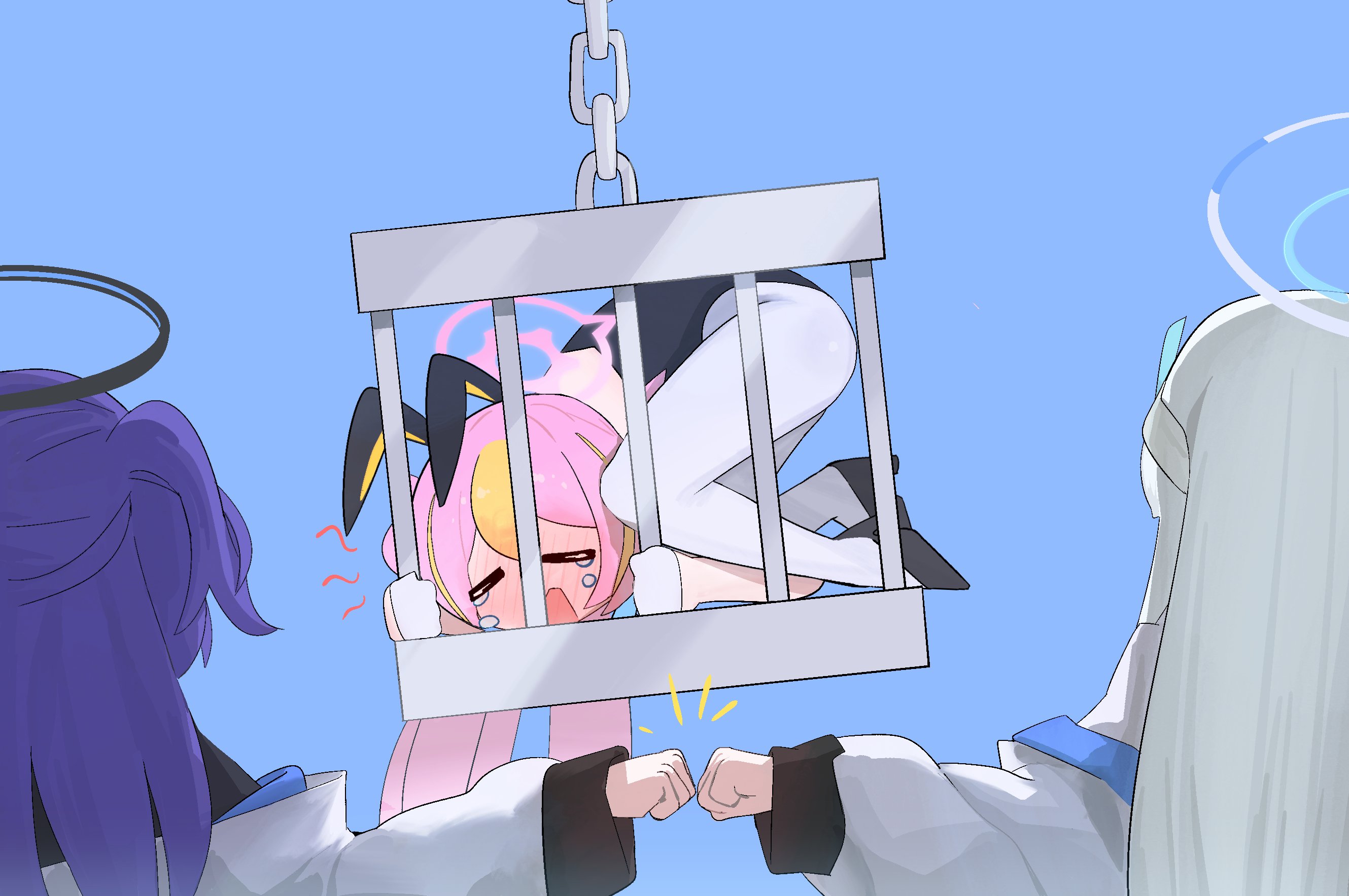 3girls animal_ears black_footwear black_leotard black_shirt blonde_hair blue_archive blue_background blush bonefire0909 cage chain closed_eyes commentary crying fake_animal_ears fist_bump from_behind halo high_heels highres in_cage jacket koyuki_(blue_archive) koyuki_(bunny)_(blue_archive) leotard long_hair long_sleeves mechanical_halo multiple_girls noa_(blue_archive) off_shoulder open_mouth outstretched_arm pantyhose pink_hair playboy_bunny purple_hair rabbit_ears rabbit_hole_(vocaloid) shirt sidelocks simple_background straight_hair untranslatable_commentary twintails two_side_up upper_body vocaloid white_hair white_jacket white_pantyhose yuuka_(blue_archive)