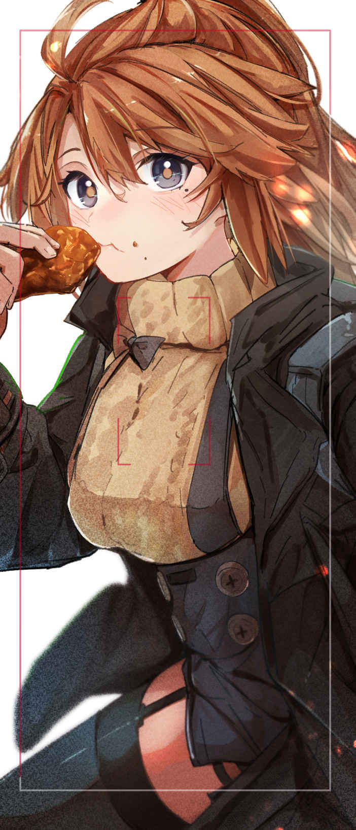 1girl :t ahoge arknights black_eyes black_jacket black_skirt black_thighhighs breasts brown_sweater buttons collared_jacket cowboy_shot crumbs double-breasted eating food from_side garter_straps hand_up high-waist_skirt highres holding holding_food inset_border jacket large_breasts long_hair long_sleeves looking_at_viewer motsupu open_clothes open_jacket orange_hair orange_pupils pinecone_(arknights) simple_background skirt solo suspender_skirt suspenders sweater thighhighs turtleneck turtleneck_sweater white_background zettai_ryouiki