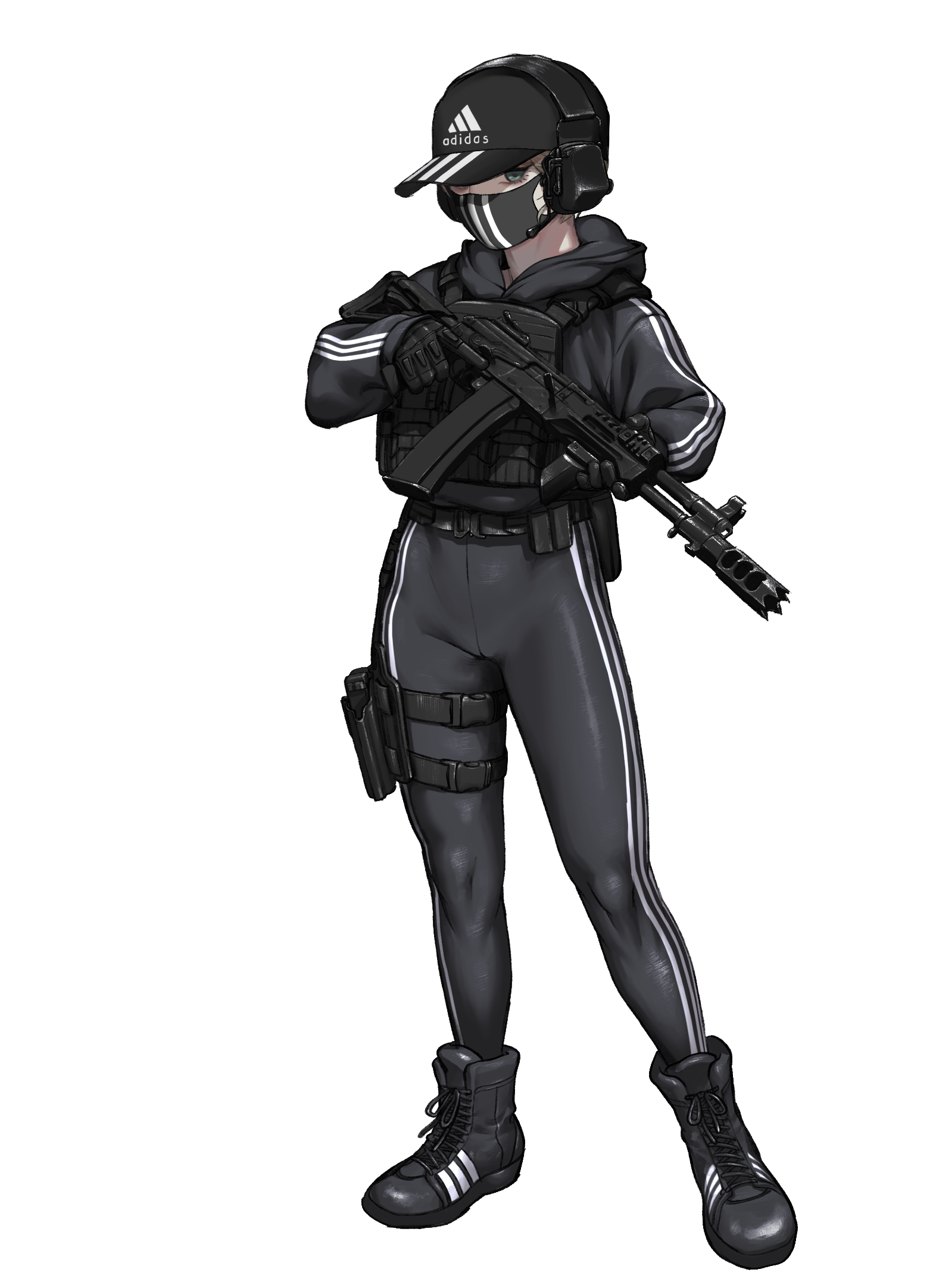 1girl adidas ak-12 armor assault_rifle baseball_cap black_mask boots bow bulletproof_vest ear_protection full_body green_eyes gun handgun hat highres holding holding_gun holding_weapon holster jacket kalashnikov_rifle korean_commentary lace-up_boots large_variant_set looking_at_viewer mask mouth_mask original pants rifle short_hair simple_background solo striped_bow striped_clothes striped_jacket striped_pants suddm thigh_holster tight_clothes tight_pants track_jacket trigger_discipline variant_set weapon white_background