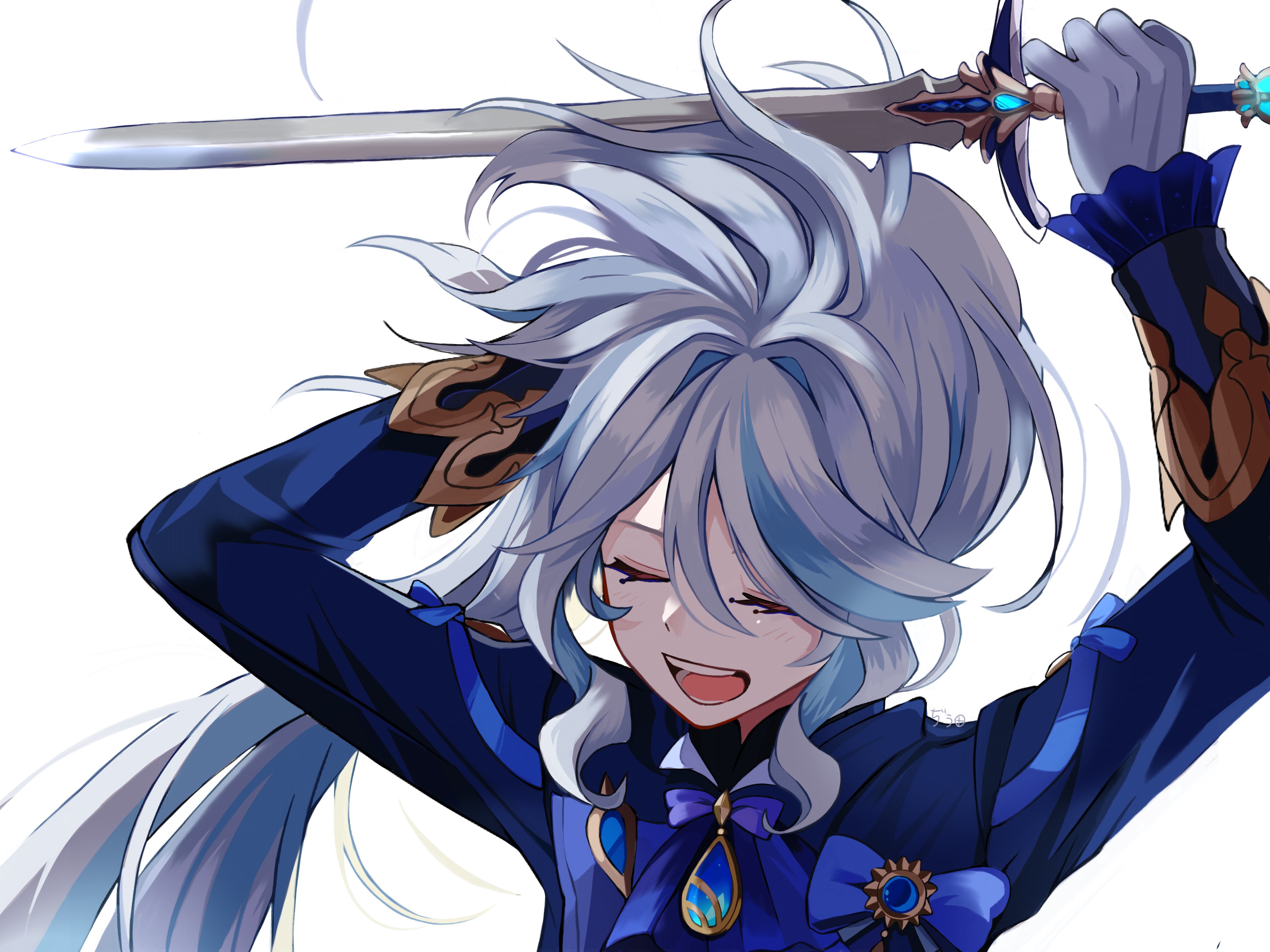 1girl :d absurdres arms_up ascot blue_ascot blue_bow blue_hair blue_jacket bow brooch closed_eyes commentary cutting_hair cutting_own_hair furina_(genshin_impact) genshin_impact gloves highres holding holding_own_hair holding_sword holding_weapon jacket jewelry long_hair long_sleeves multicolored_hair open_mouth smile solo streaked_hair sword teeth upper_body very_long_hair wafuu_tsunamayo weapon white_gloves