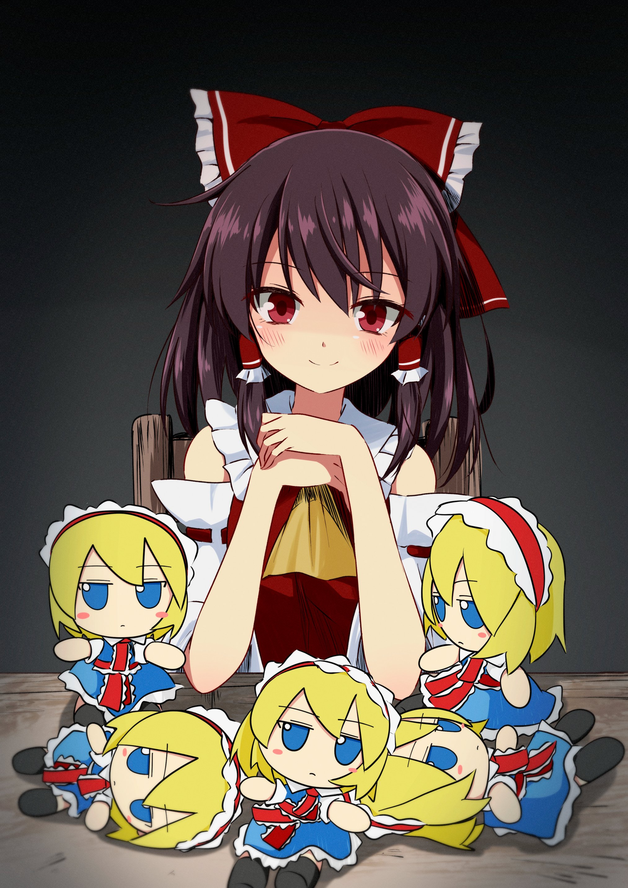 1girl absurdres alice_margatroid ascot bare_shoulders blue_dress blue_eyes bow brown_hair chair character_doll closed_mouth collared_shirt commentary_request detached_sleeves doll dress frilled_ascot frilled_hairband frilled_sash frills fumo_(doll) gradient_background grey_background hair_bow hairband hakurei_reimu highres jitome lolita_hairband long_hair long_sleeves red_ascot red_bow red_eyes red_sash red_shirt sash shirt sidelocks sleeveless sleeveless_shirt smile solo table too_many_dolls touhou tsuukinkaisoku_oomiya upper_body white_shirt white_sleeves wide_sleeves wooden_chair yellow_ascot