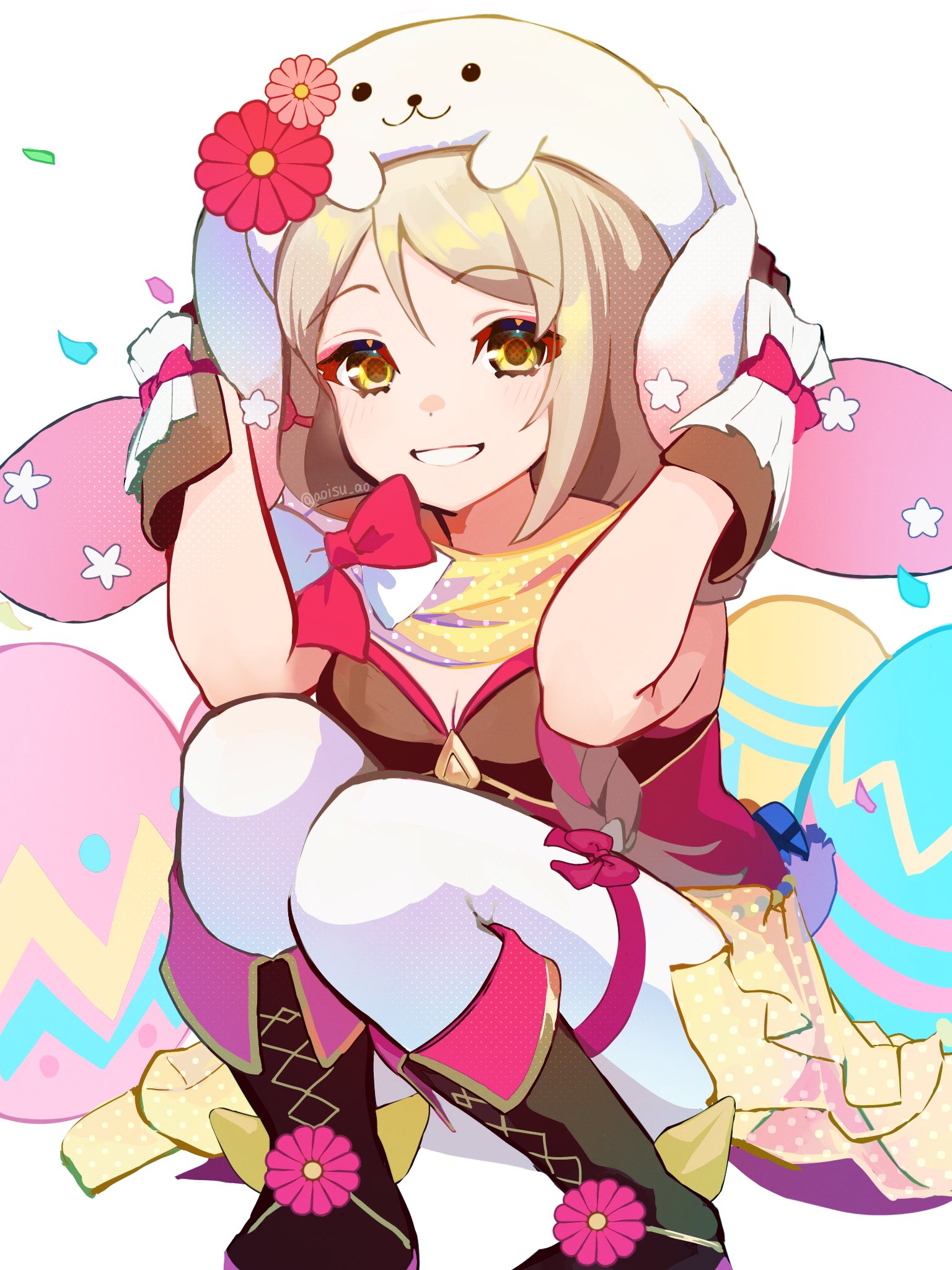 1girl animal_hat aoisu_ao blonde_hair braid braided_ponytail brown_gloves easter easter_egg egg expressive_clothes fire_emblem fire_emblem_engage fire_emblem_heroes flower_ornament framme_(fire_emblem) framme_(spring)_(fire_emblem) gloves hair_over_shoulder hat highres nintendo official_alternate_costume pantyhose pink_hair rabbit_hat scarf smile solo white_pantyhose yellow_eyes yellow_scarf