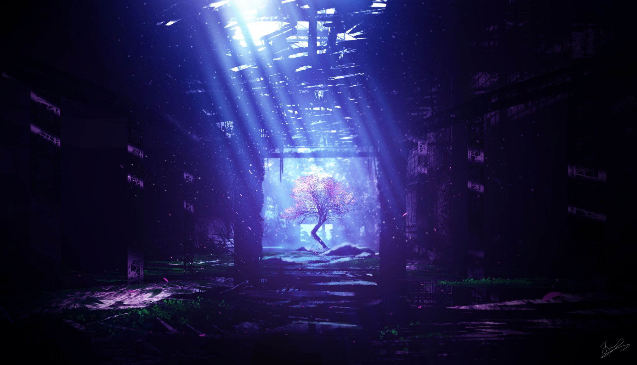 abandoned building cherry_blossoms dappled_sunlight grass highres huashijw indoors landscape light_rays no_humans original overgrown pillar ruins scenery sunlight tree vanishing_point