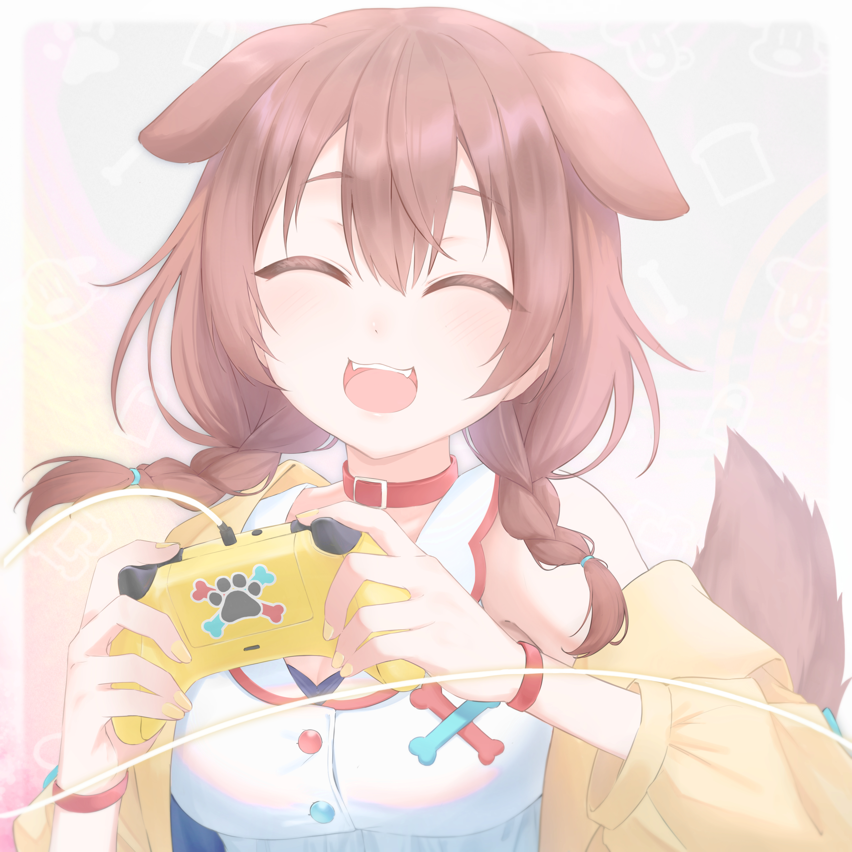 1girl :3 :d ^_^ a9_(repainter) absurdres animal_ears blush braid breasts brown_hair buttons cable cartoon_bone closed_eyes collar collared_dress commentary controller dog_ears dog_girl dog_tail dress fangs fingernails futo-inu game_controller hair_between_eyes hair_tie hands_up highres holding holding_controller holding_game_controller hololive hoso-inu inugami_korone inugami_korone_(1st_costume) jacket long_hair long_sleeves low_twin_braids medium_breasts multicolored_background nail_polish off_shoulder open_clothes open_jacket open_mouth paw_print red_collar sidelocks simple_background sleeveless sleeveless_dress smile solo tail teeth twin_braids upper_body upper_teeth_only virtual_youtuber white_dress yellow_jacket yellow_nails