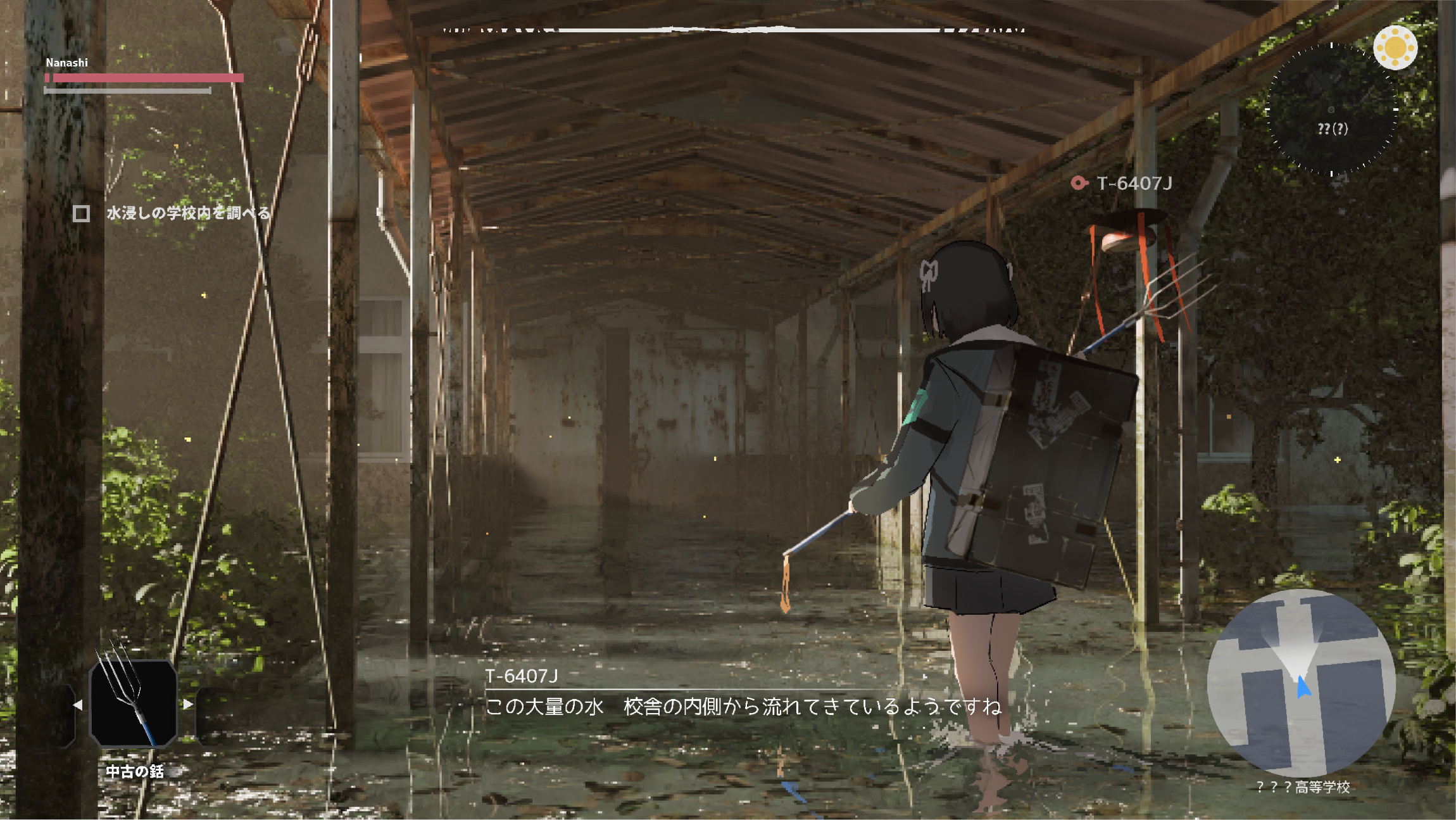 black_hair dialogue_box drone fake_screenshot gameplay_mechanics green_jacket harpoon heads-up_display highres holding holding_weapon horror_(theme) jacket lost_property_control_organization_(samidare) minimap protagonist_(lost_property_control_organization) ribbon samidare_(hoshi) skirt subtitled t-6407j_(samidare) user_interface water weapon white_ribbon