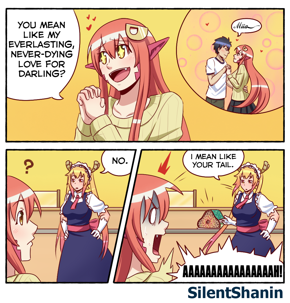 +_+ 1boy 2girls ? artist_name blonde_hair blue_dress blush bubble closed_mouth crossover dragon_girl dragon_horns dress elbow_gloves english_text fangs food gloves hair_ornament hairclip hands_on_own_hips head_tilt heart holding_hands horns kobayashi-san_chi_no_maidragon kurusu_kimihito lamia long_hair long_sleeves looking_at_another maid meat miia_(monster_musume) monmusu monster_girl multiple_girls neckerchief open_mouth orange_eyes own_hands_clasped own_hands_together pointy_ears puffy_short_sleeves puffy_sleeves red_eyes red_hair red_neckerchief shirt short_sleeves silent-shanin speech_bubble surprised teeth tohru_(maidragon) upper_teeth_only white_gloves white_shirt
