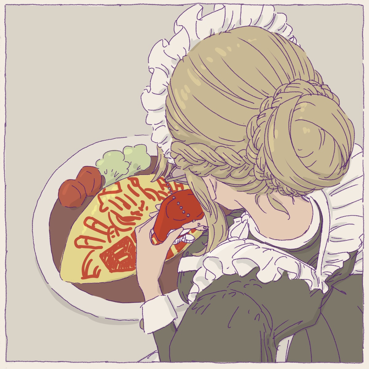 1girl ade_(nikke) apron black_dress blonde_hair bow bowtie braid broccoli dress food food_writing goddess_of_victory:_nikke highres holding juliet_sleeves ketchup ketchup_bottle long_hair long_sleeves maid maid_headdress mero_(ilsttkgbz11) omelet omurice plate puffy_sleeves sidelocks solo white_apron white_bow white_bowtie