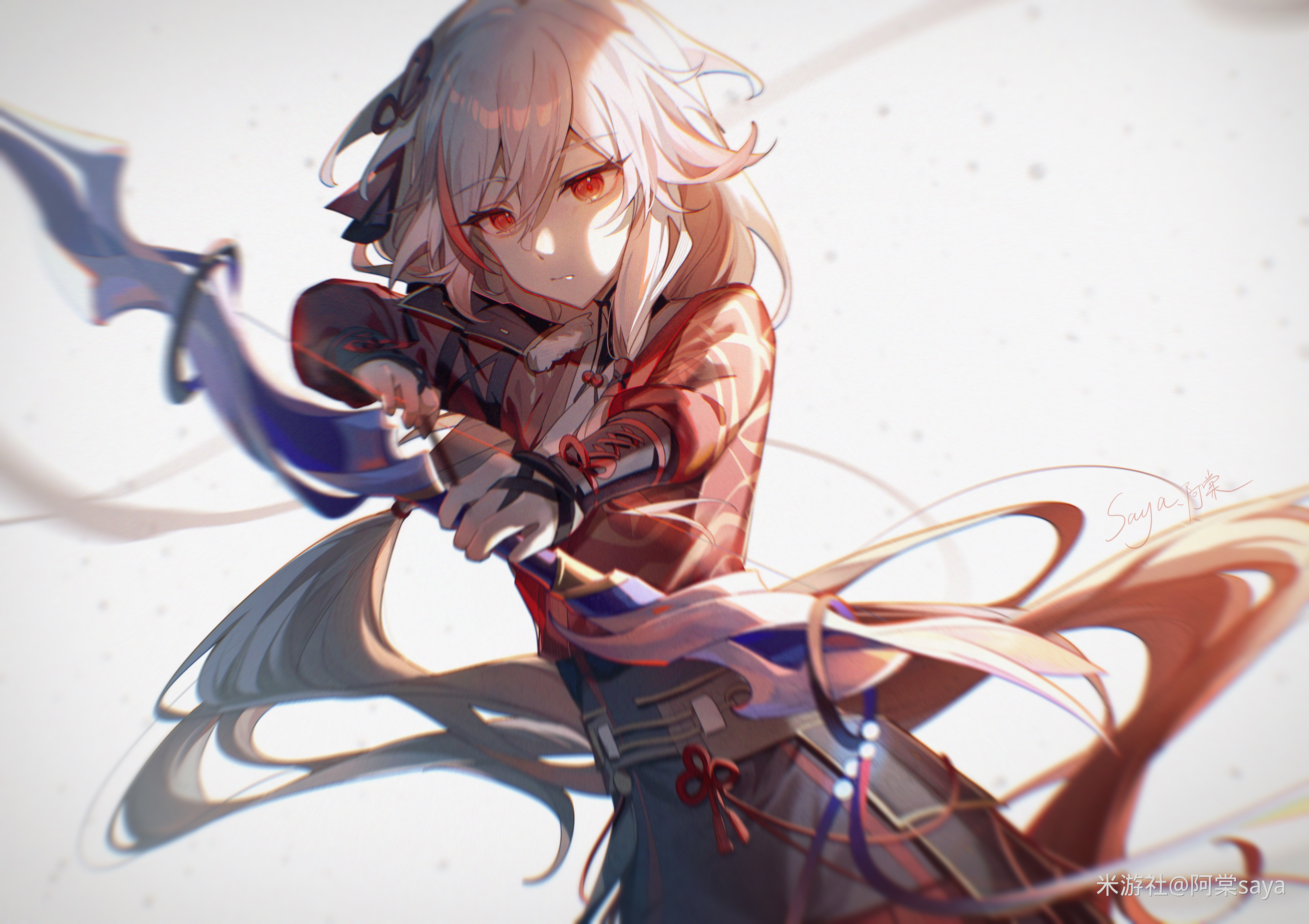 1girl absurdres armor artist_name black_gloves bow_(weapon) china_dress chinese_clothes chinese_text closed_mouth dress elbow_gloves faulds fingerless_gloves fu_hua fu_hua_(margrave_(b)) fu_hua_(phoenix) gloves gradient_hair hair_between_eyes hair_ornament hanfu highres holding holding_bow_(weapon) holding_weapon honkai_(series) honkai_impact_3rd long_hair looking_at_viewer low-tied_long_hair low_ponytail multicolored_hair official_alternate_costume partially_shaded_face ponytail red_dress red_eyes red_hair red_hanfu saya_atang simple_background simplified_chinese_text solo streaked_hair string string_of_fate weapon white_background white_hair