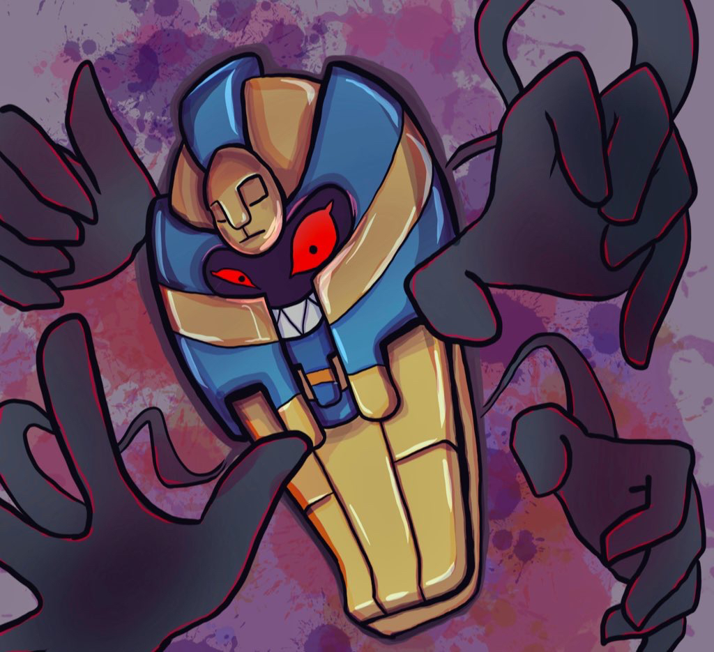 cofagrigus gen_5_pokemon grin looking_at_viewer namakura_g nintendo no_humans pokemon pokemon_(creature) red_eyes sharp_teeth smile solo teeth