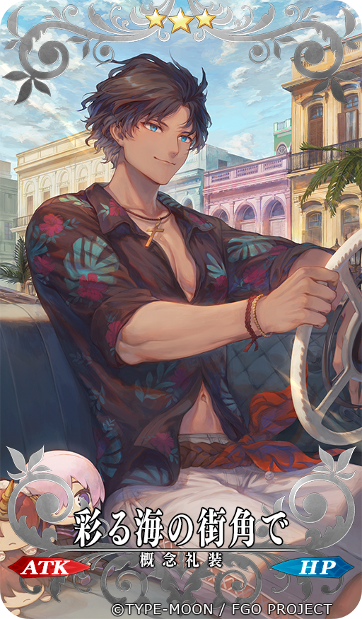 1boy bartholomew_roberts_(at_the_street_corner_of_the_decorating_sea)_(fate) bartholomew_roberts_(fate) black_hair black_shirt blue_eyes bracelet building car card_(medium) character_doll cloud convertible copyright_notice cowboy_shot craft_essence_(fate) cross cross_necklace dark-skinned_male dark_skin day doll driving fate/grand_order fate_(series) floral_print frankenstein's_monster_(fate) frankenstein's_monster_(fate/apocrypha) fuuma_kotarou_(fate) hawaiian_shirt jewelry looking_ahead male_focus mash_kyrielight mashutarou_(neko_no_oyashiro) motor_vehicle navel necklace official_art palm_tree parted_bangs partially_unbuttoned pectoral_cleavage pectorals red_sash road rolling_eyes sash shirt short_hair shorts smile solo street tree white_shorts
