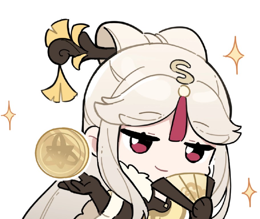 1girl brown_gloves closed_mouth folding_fan genshin_impact gloves hair_ornament hair_stick hand_fan hand_up holding holding_fan looking_at_viewer mora_(genshin_impact) ningguang_(genshin_impact) red_eyes simple_background smile solo upper_body white_background xiaohutu