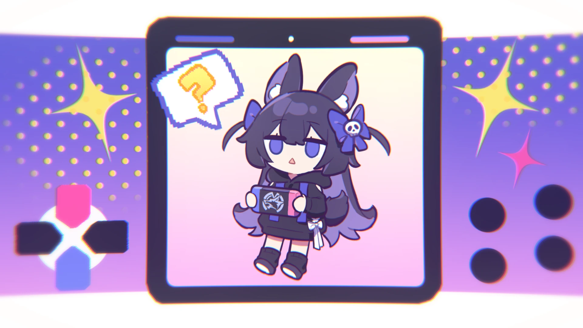 1girl adapted_costume animal_ears black_hair black_socks blue_eyes bow colored_inner_hair fox_ears hair_bow hair_ornament highres honkai:_star_rail honkai_(series) long_hair looking_to_the_side multicolored_hair nintendo_switch open_mouth original purple_bow rabbit_tail silver_wolf_(honkai:_star_rail) skull_hair_ornament socks solo tail triangle_mouth two_side_up very_long_hair xiao_hutu xiaohutu